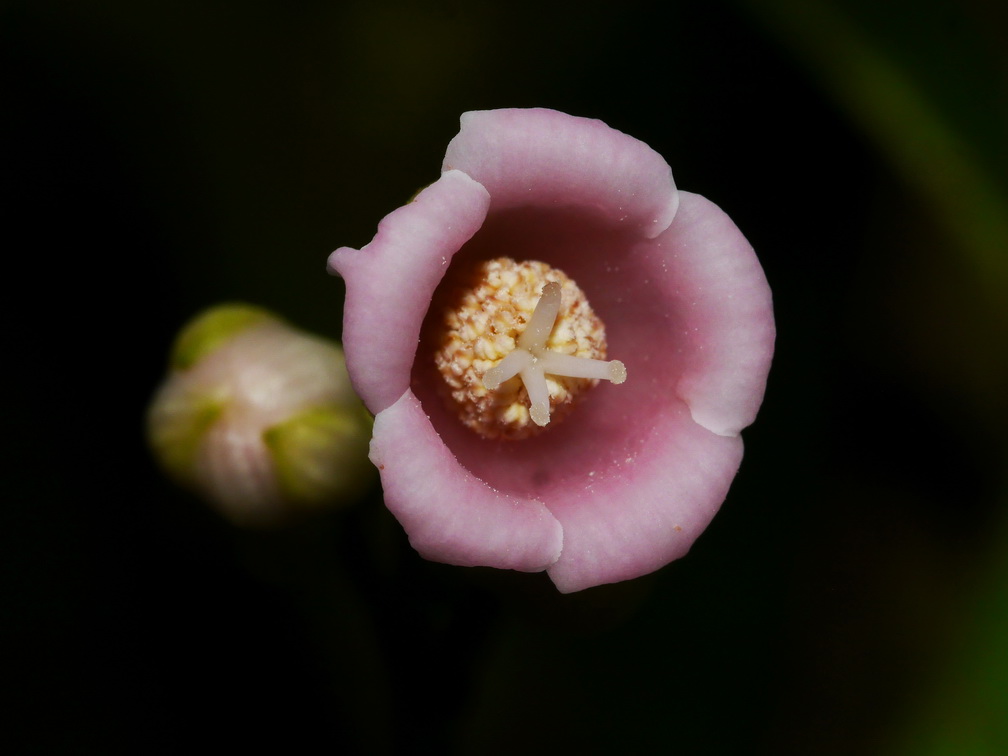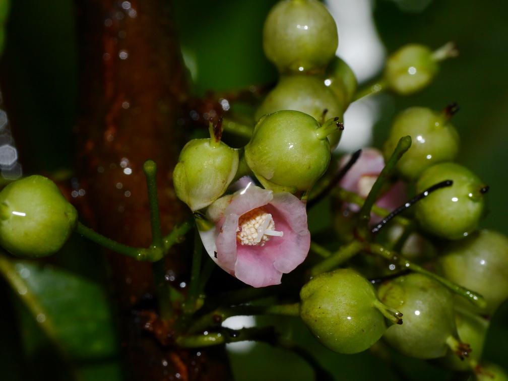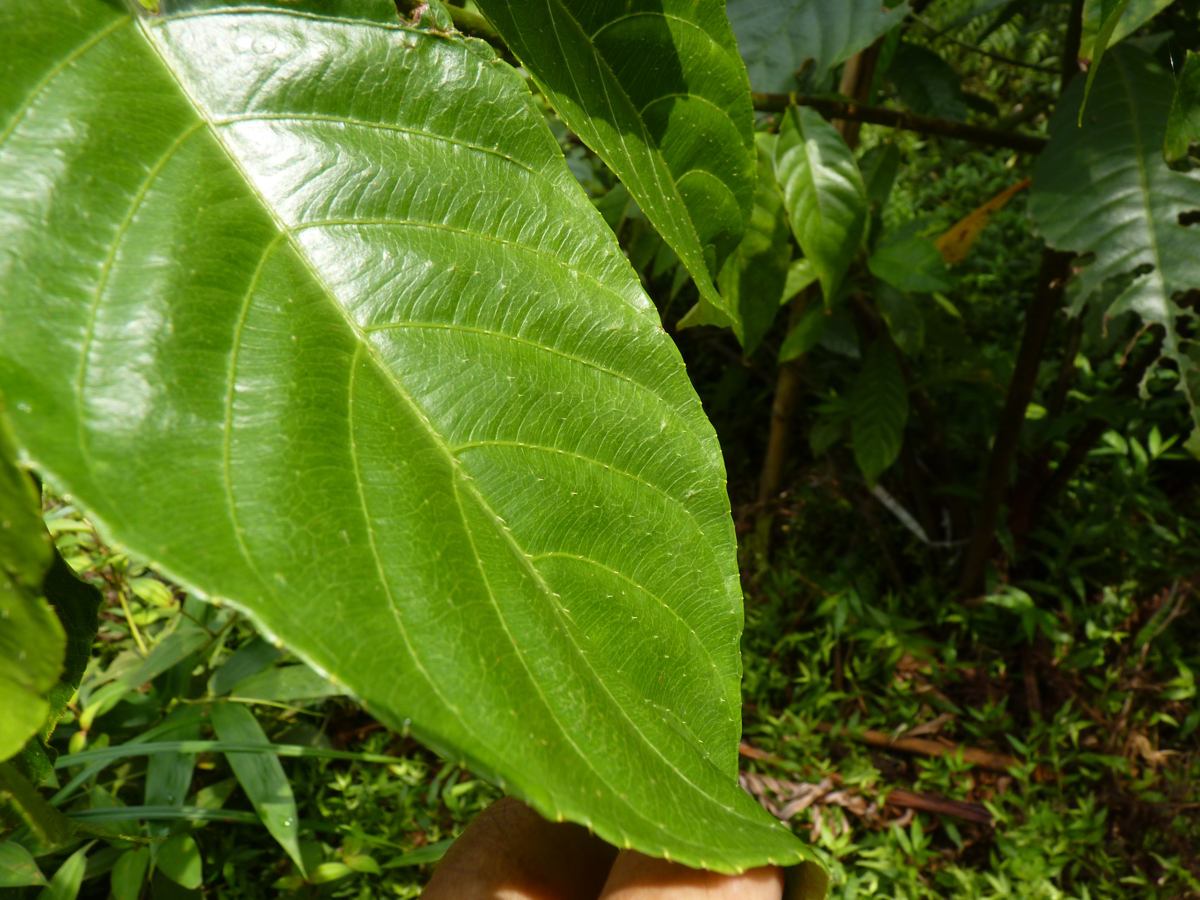 葉大,葉緣具細鋸齒,葉表有細毛觸感粗糙,花小徑約一公分,花瓣五片粉紅色,果為球形漿果徑近一公分,熟果白富黏液味甘甜,種子多數。