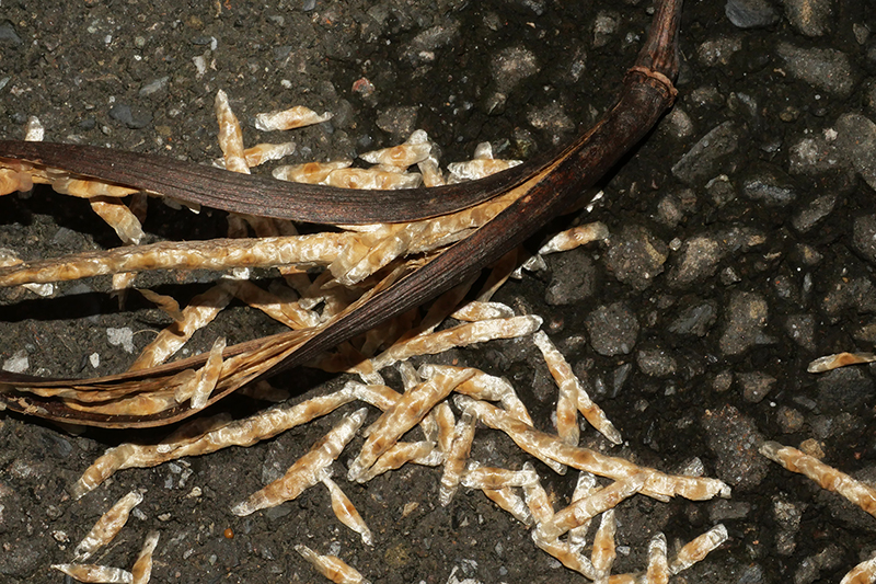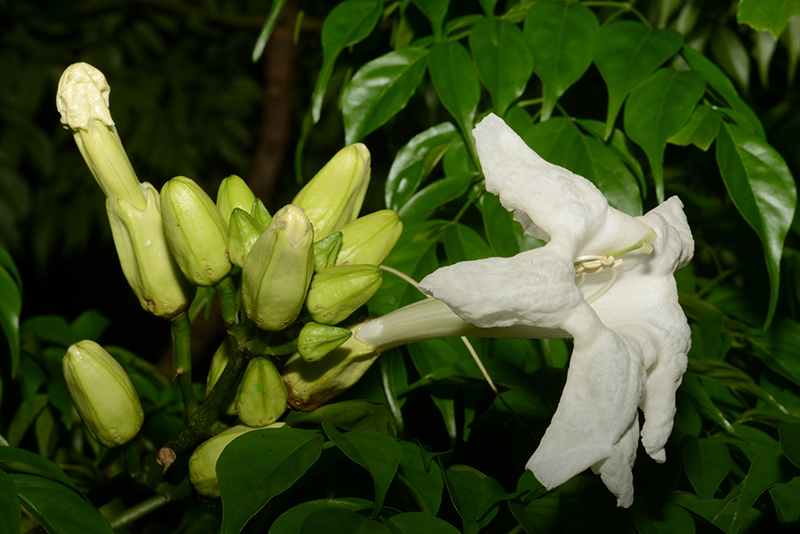 夜間開花,圓錐花序。花朵白色漏斗形先端五裂, 大小接近百合花。朔果長形像彎曲的菜豆, 長可達50公分。一個蒴果內可以長出將近千粒種子, 種子兩端有薄翅。