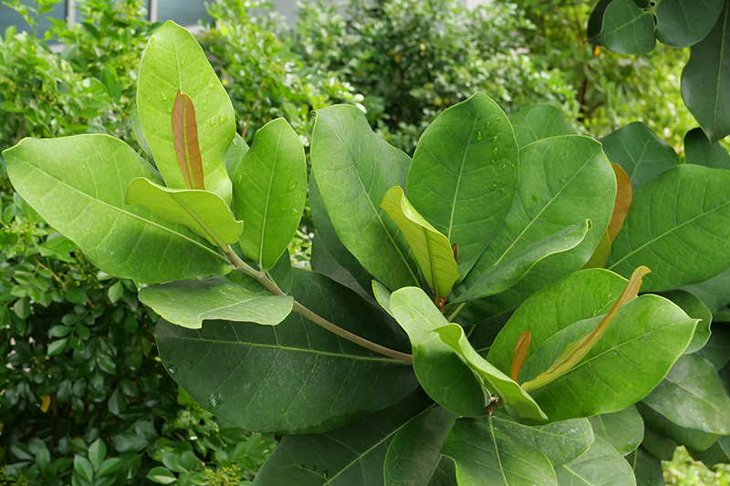 大葉山欖的葉子很大,略帶反捲,長度可超過十公分,葉柄長約一公分。 葉上的厚革質再加上樹皮內的乳汁, 可減少水分蒸散而適應生長在海邊地區。年輕時樹幹淺褐色,新枝呈現灰白色而幼葉紅色。 老樹的樹葉長在枝條頂端,舊葉脫落有時留下葉痕,樹幹黑褐色,壯碩高大。
