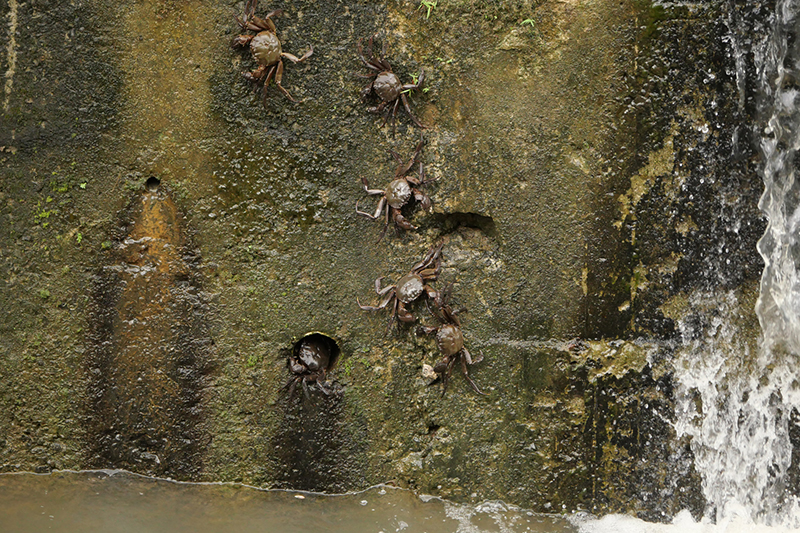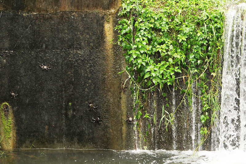 毛蟹從壩頂再沿壩壁往下爬到溢洪堰底部
