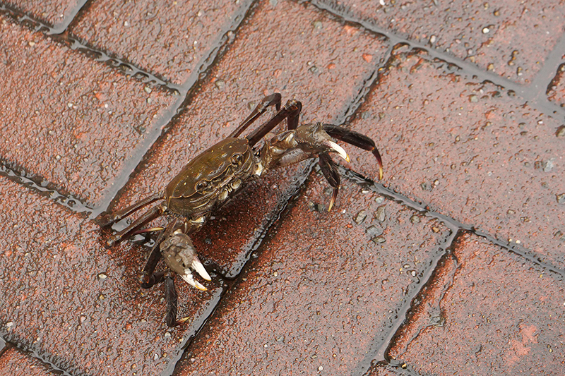 院區生態池或草溝的毛蟹想要下四分溪,走到人文館前的馬路。