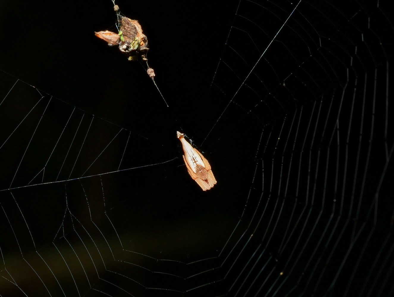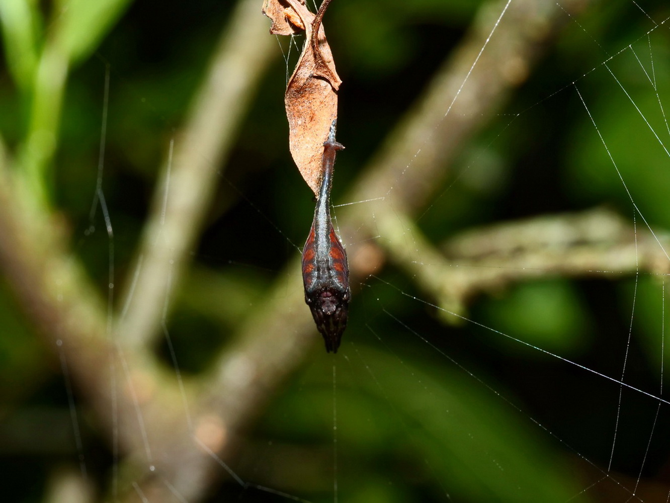 黑尾曳尾蛛, 體色有黃色、黑褐色、白色等多種顏色,頭胸背板灰褐色,腹背中央有2條縱紋,尾端細長尖突呈三叉狀,停棲息掛在網上呈直線狀,常出現於灌木叢的枝葉間,也常倒掛在屋簷下,偽裝成枯葉具偽裝和隱蔽的效果,葉柄的部份是腹部的延伸,葉片的末端是褐色的頭胸部,這形態與同樣偽裝成枯葉的枯葉尖鼻蛛恰好相反. 主要分布於平地至山區,但停棲於矮叢灌木的枝葉間時,偽裝成枯葉,不易發現.