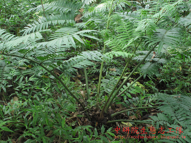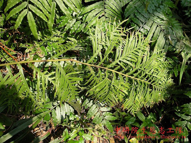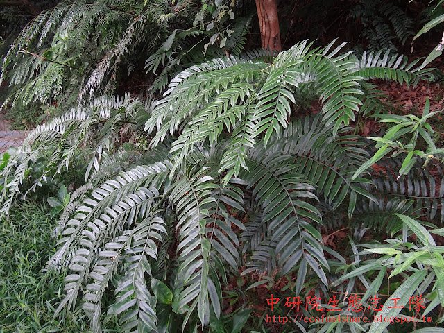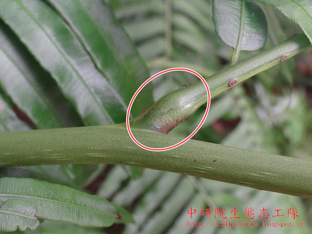 觀音座蓮-葉柄上的「葉枕」可以控制葉片水分的進出-陽光強烈或是水分缺乏時-葉枕細胞萎縮,使得葉片-羽片下垂-以減少水分蒸發 |