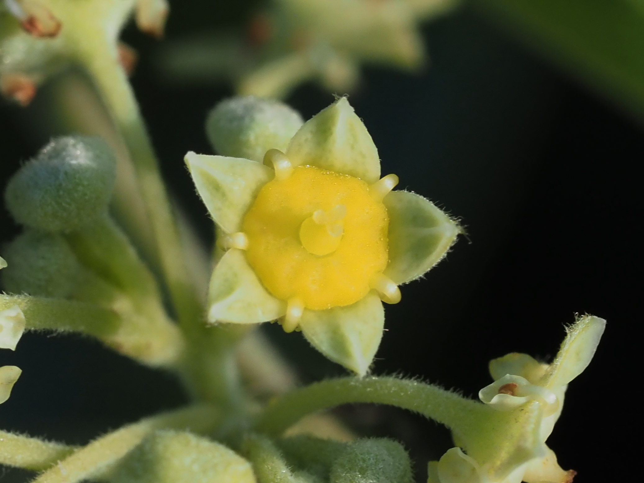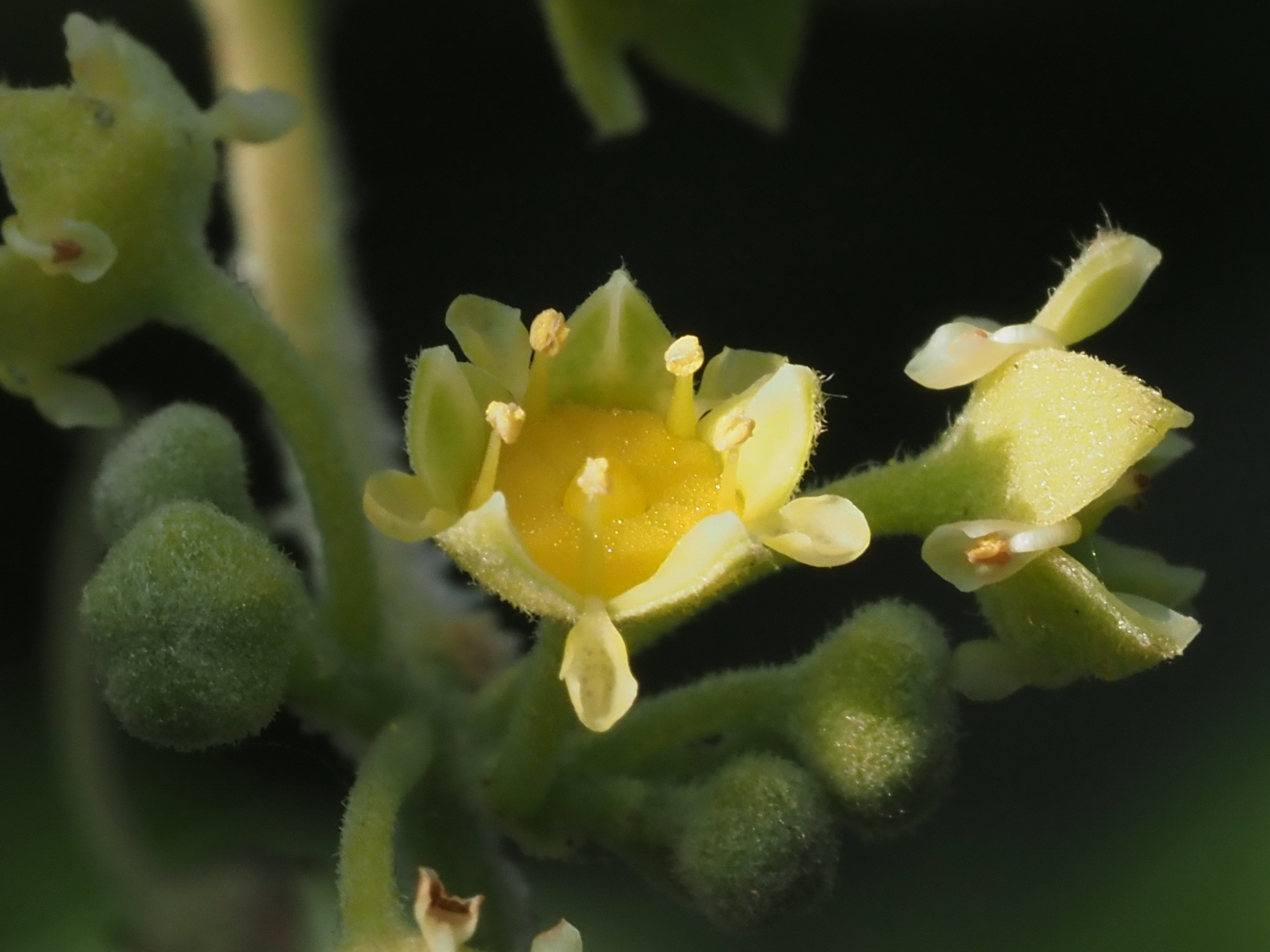 花兩性,雌雄異熟,雄先熟,聚繖花序,花黃綠色萼片5,呈三角形,被茸毛,花瓣5,呈兜狀,雄蕊5與花瓣對生,子房部份埋於花盤中,花盤很大,蜜特別多,3室,花期 6~8 月。