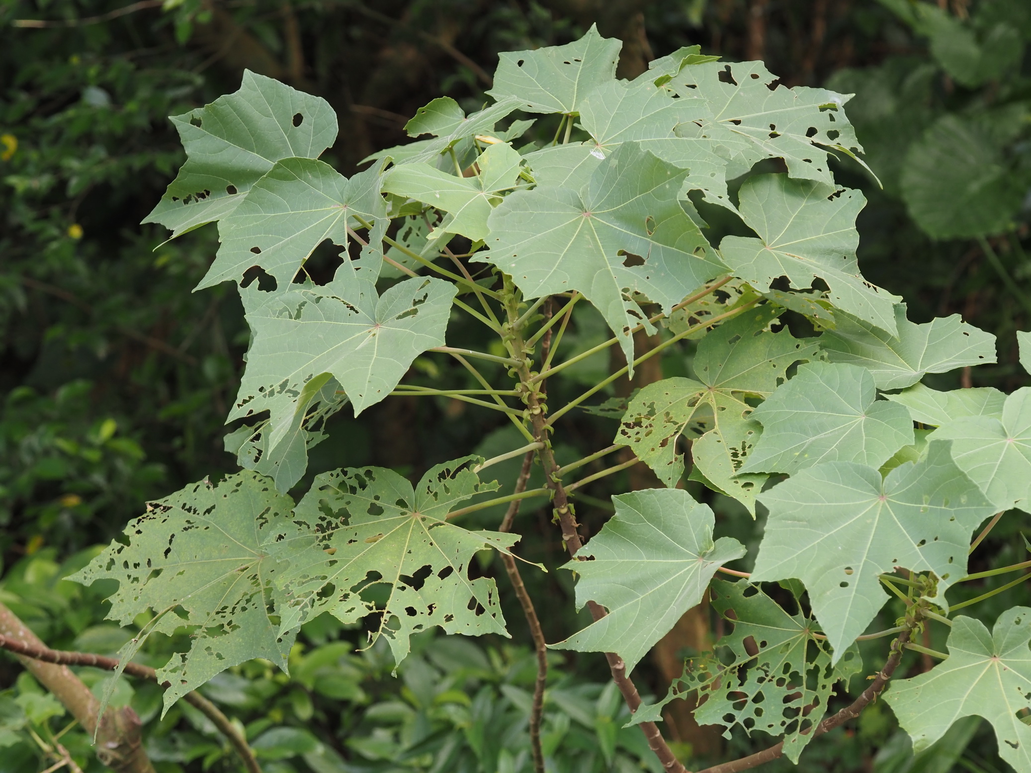 單葉3-5淺裂,掌狀脈,葉柄圓柱形 |