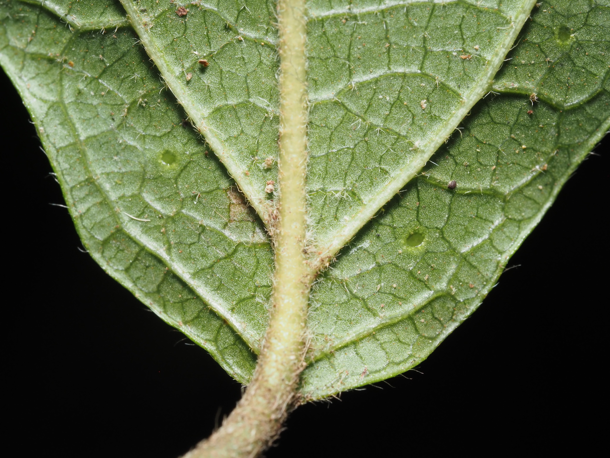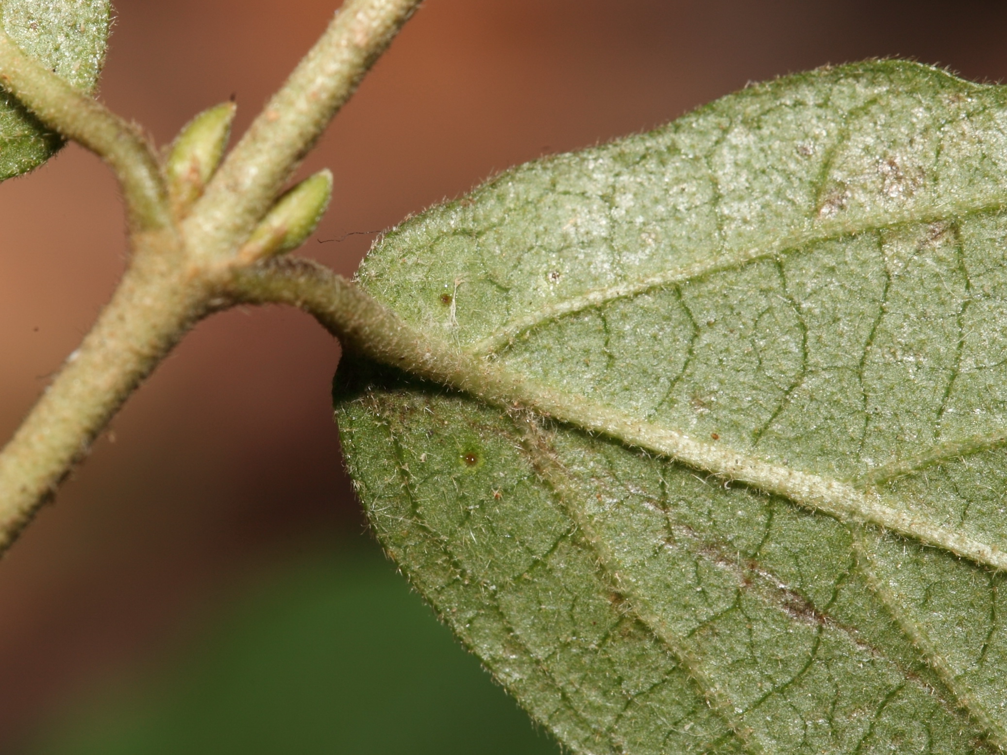 灌木或小喬木,小枝被短毛,單葉,對生,葉紙質,生殖枝上者卵形,營養枝上者長橢圓至橢圓形,先端漸尖或銳尖,鋸齒緣,上表面近光滑,下表面被星狀毛,側脈5-7對。