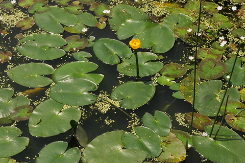 台灣萍蓬草為睡蓮科(Nymphaeaceae) 萍蓬草屬(Nuphar)原生地在台灣分布於台灣北、中部低海拔沼澤、埤塘或水池中的水生植物,別名水蓮花、萍蓬草、臺灣川骨等名。但近年來也因人為的開發建設,把許多沼澤、埤塘或水池遭填方而造成數量極其減少,使其瀕臨絕種。目前在桃園一帶的少數池塘中、臺北木柵動物園、宜蘭縣員山鄉的福山植物園及中央研究院生態池尚可發現臺灣萍蓬草。