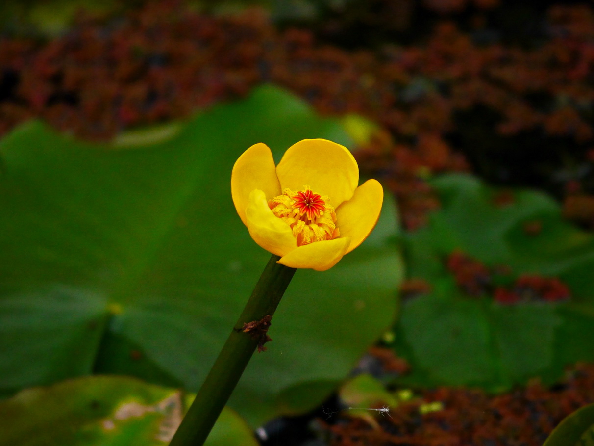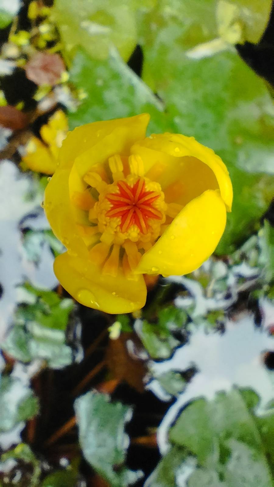 花序為單生花,花梗粗長,長 15~35 公分,挺出水面;花鮮黃色,徑 2~3 公分;萼片 5 枚,長約 2 公分,寬約 1.5 公分,革質,花瓣狀,黃色;花瓣多數,長約 0.6 公分,寬約 0.25~0.3 公分,就在雄蕊下方,雄蕊環繞在紅色的雌蕊外圍俗稱黃花紅心為其特色。