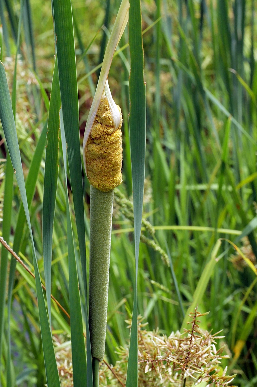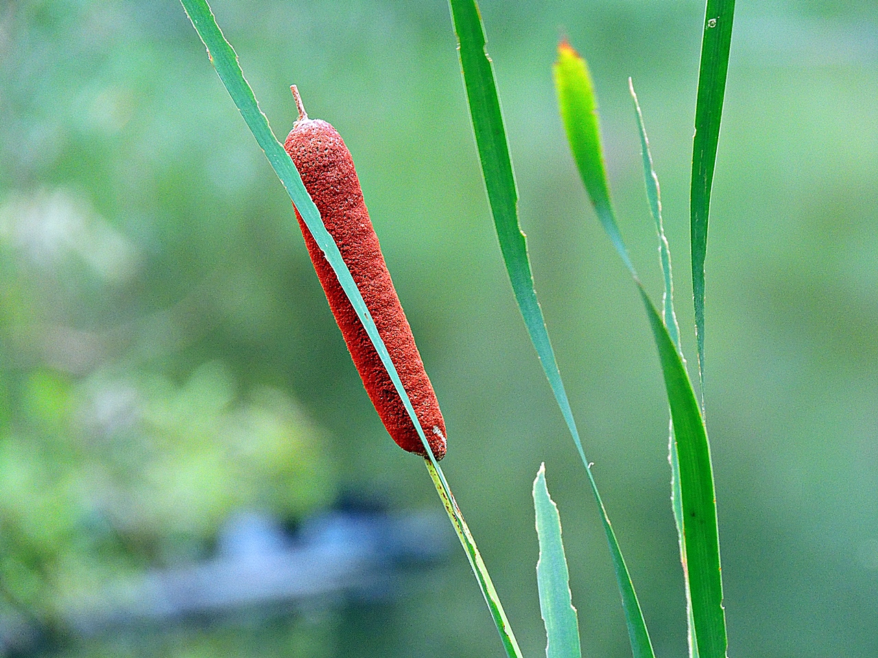 香蒲授粉後雄花逐漸掉落,雌花序變紅,雌花密集,逐漸成熟。 |