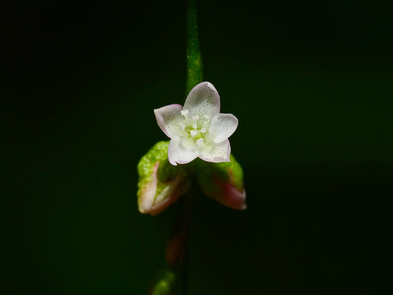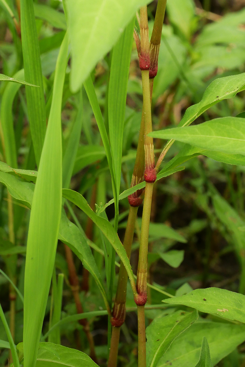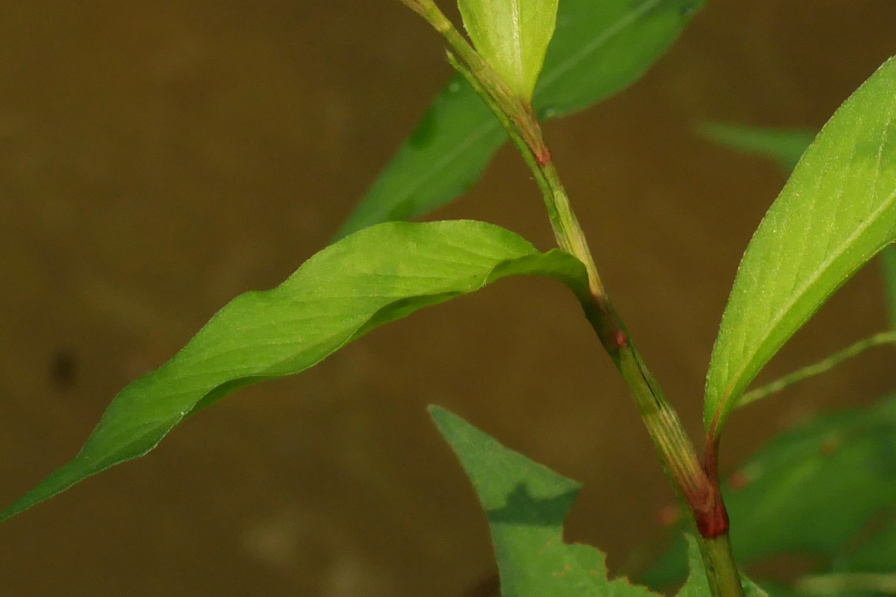 莖纖細先端彎曲,葉鞘管狀有緣毛約1/2葉鞘長,全株密被腺體,葉及花被較密,莖上毛疏密不定,關節膨大,基部紅色。單葉,互生,具短葉柄,葉披針形,葉基楔形,葉尖漸尖形,兩面具短毛,下表面具腺點。