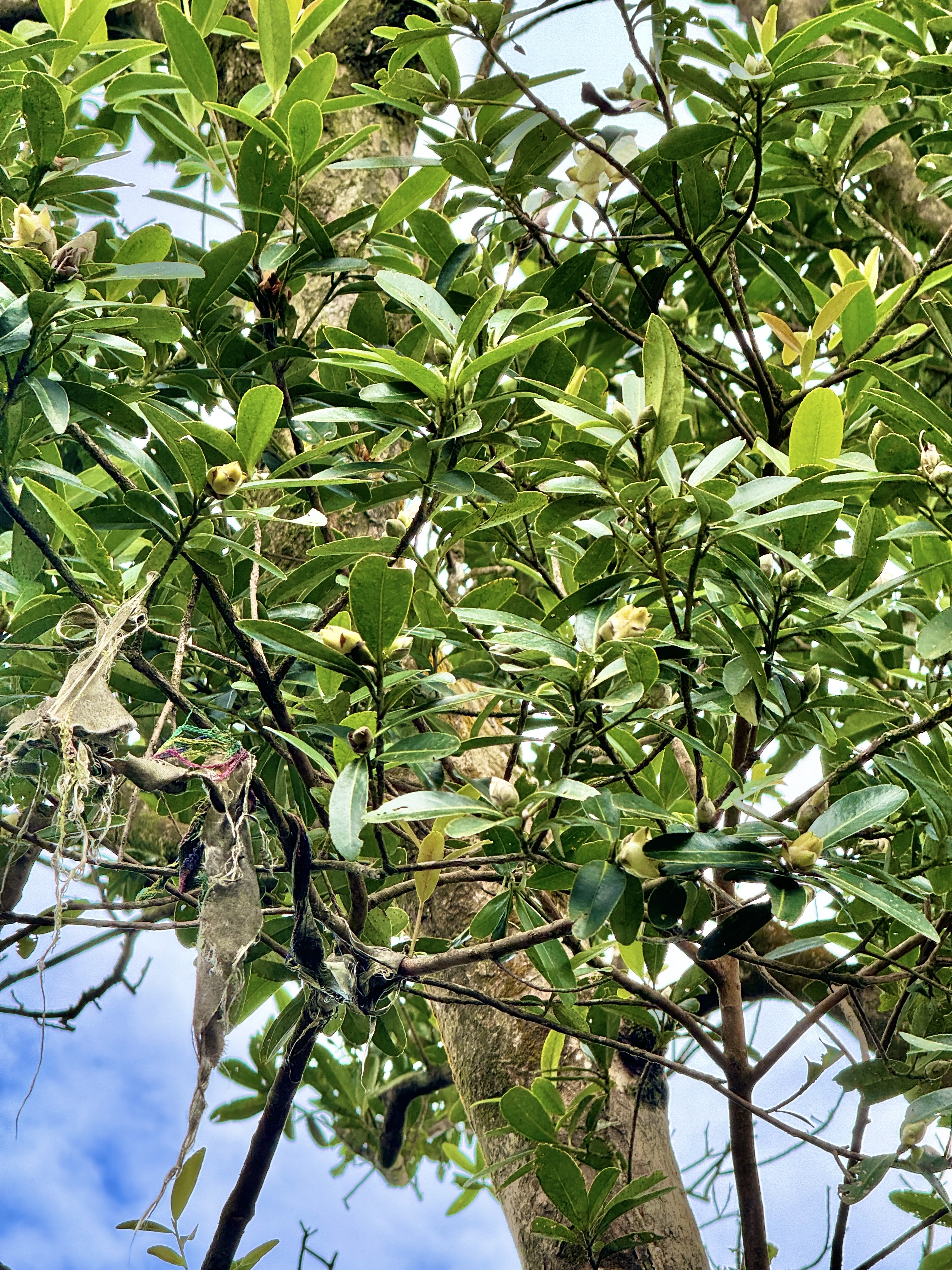 台灣原生種,大頭茶屬常綠喬木,園藝上多作為灌木使用。主幹直,枝條健壯。葉互生,革質,長橢圓形至披針形,葉面光滑,老葉近凋落時轉為紅色。花開於近枝端的葉腋,白色花5瓣,瓣緣波浪狀,花徑頗大。蒴果木質橢圓形。開花期秋至冬季,結果期春至夏季。