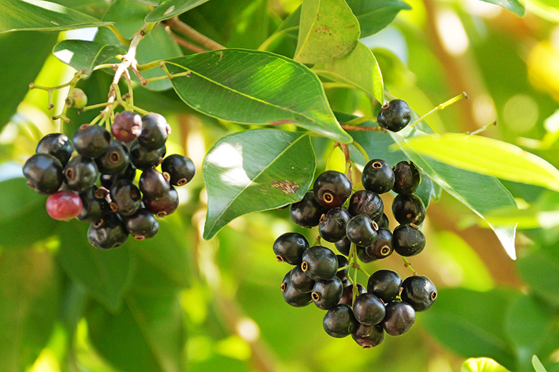 核果球形,由綠轉紅再變成紫黑色。是一些鳥類和哺乳類的美食。