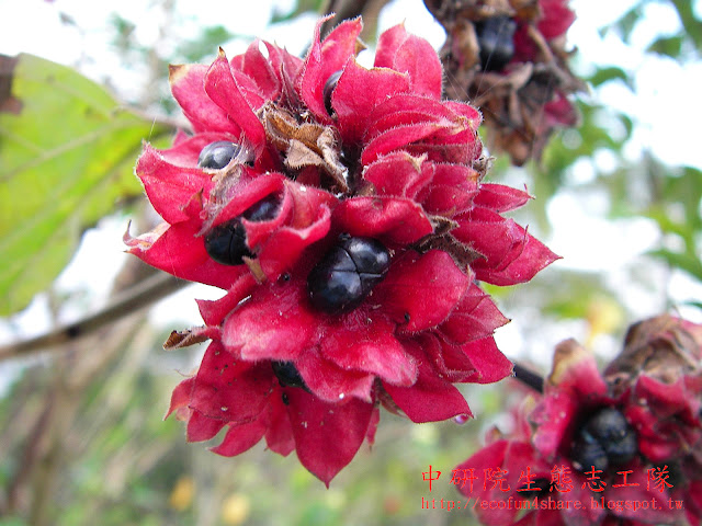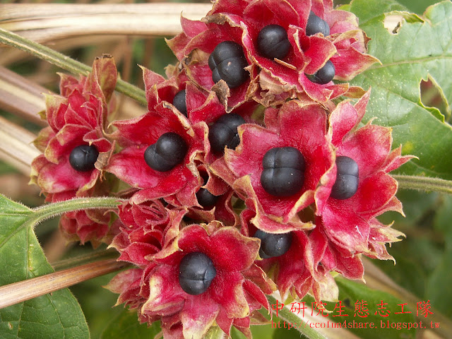 熟果深藍色或黑色,漿汁多,被紅色宿存萼片包圍著 |