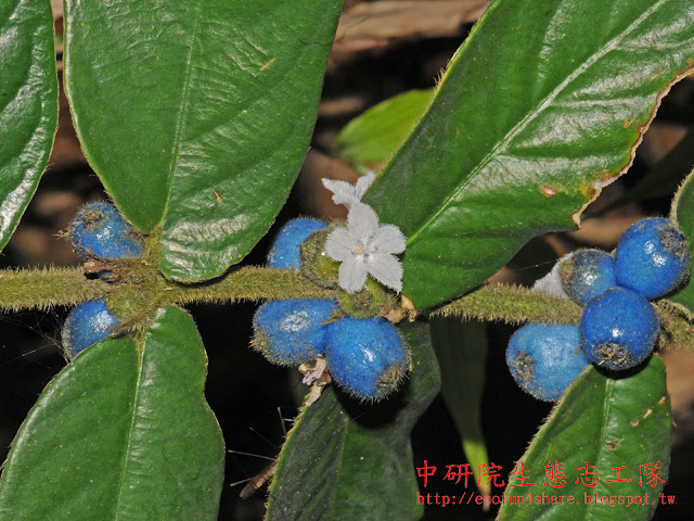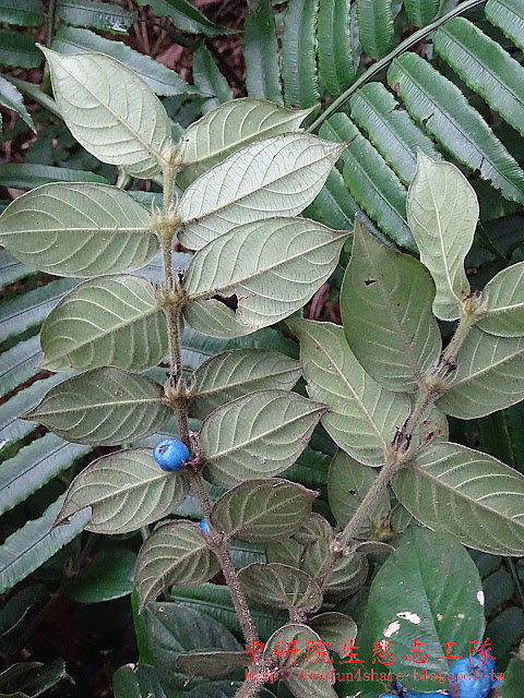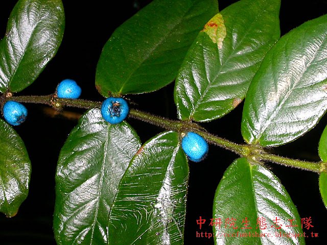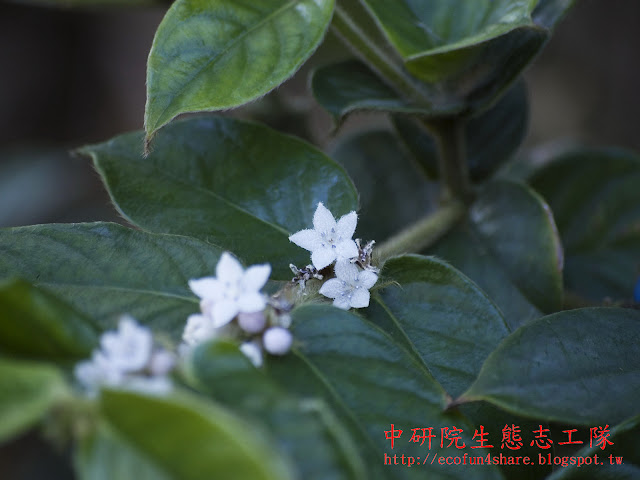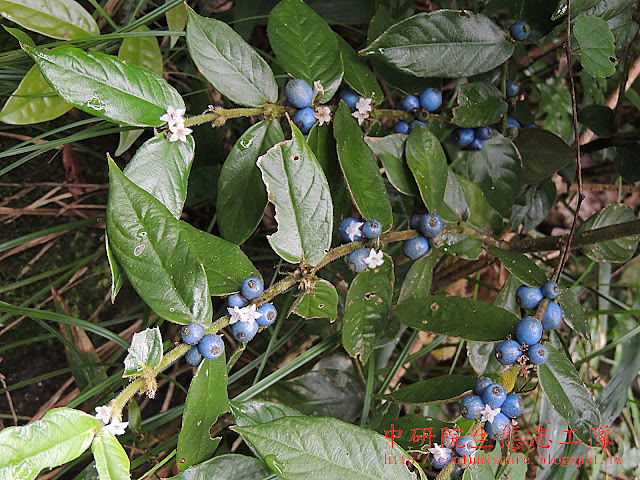 圓葉雞屎樹為多年生常綠灌木,據說是因搓揉其葉後帶有雞屎味,故稱雞屎樹,其實只不過是青草的腥味重了些罷了。名字雖不雅,但其白色小花及藍寶石般的果實,在黝暗的林下,顯得格外耀眼,令人驚艷。