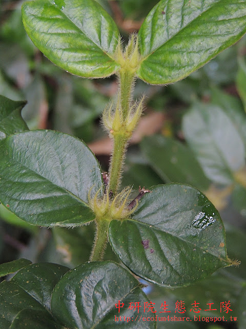 圓葉雞屎樹,葉下表面中肋和側脈明顯凸起,密被粗長毛 |