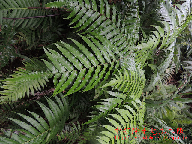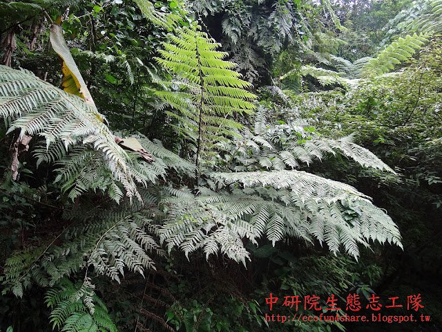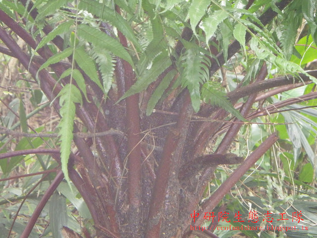 台灣常見三大樹蕨,按樹高由高至矮依序為筆筒樹、台灣桫欏、鬼桫欏。筆筒樹的中軸咖啡色,台灣桫欏的中軸綠色,鬼桫欏的中軸 紫褐色。