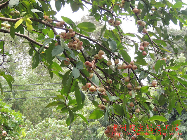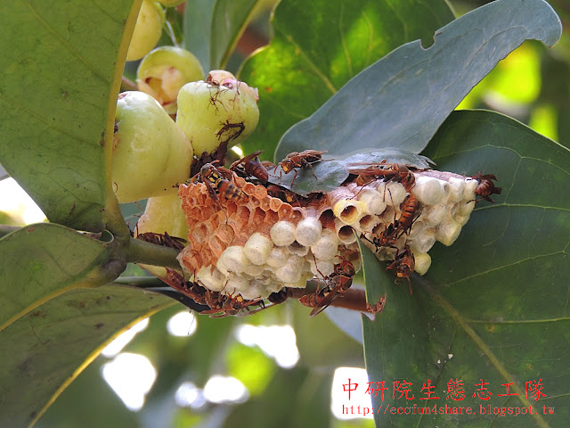 結果的蓮霧樹上有一個 雙斑長腳蜂 的蜂巢 |