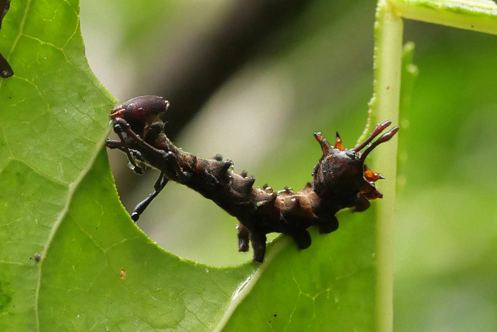 弓紋蟻舟蛾幼蟲正在啃食穗花棋盤腳葉片BUT 你知道那端是頭嗎?(陳宗憲攝)