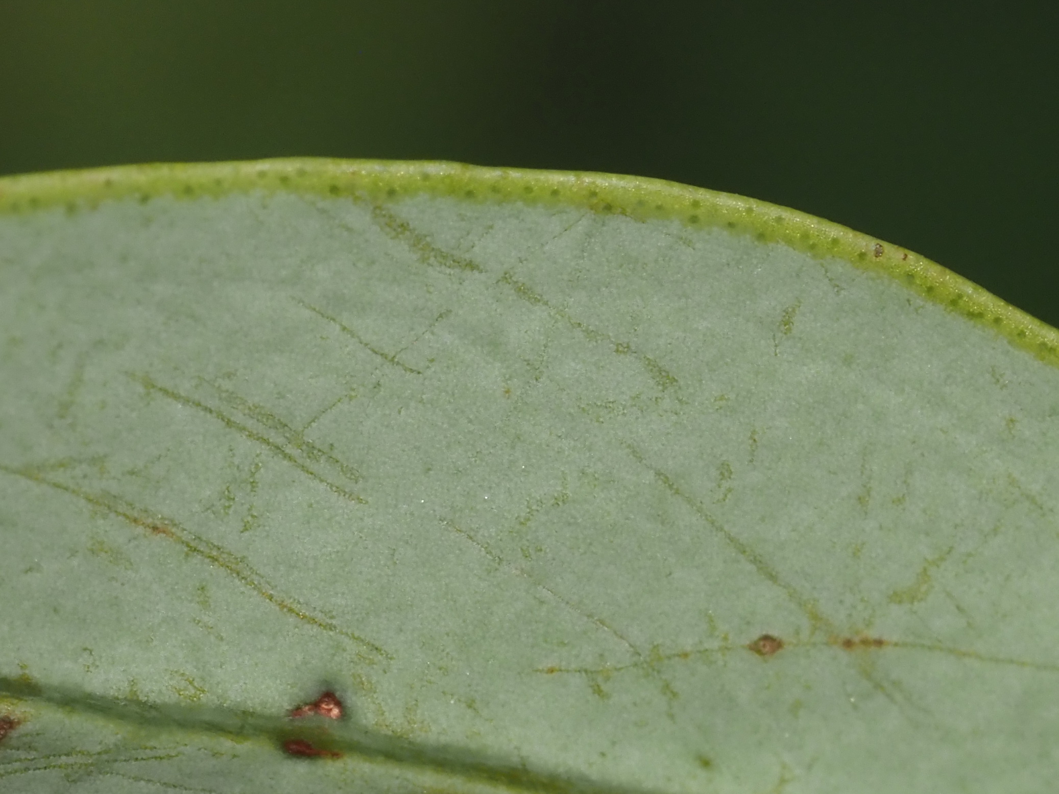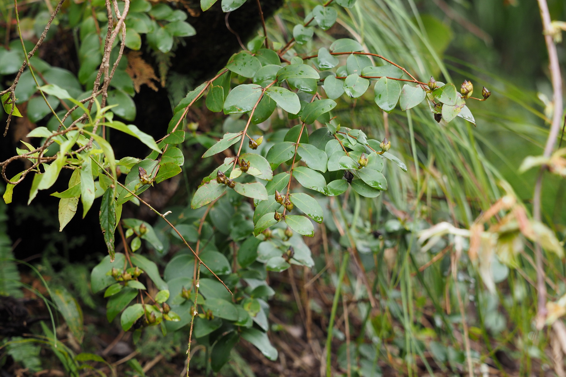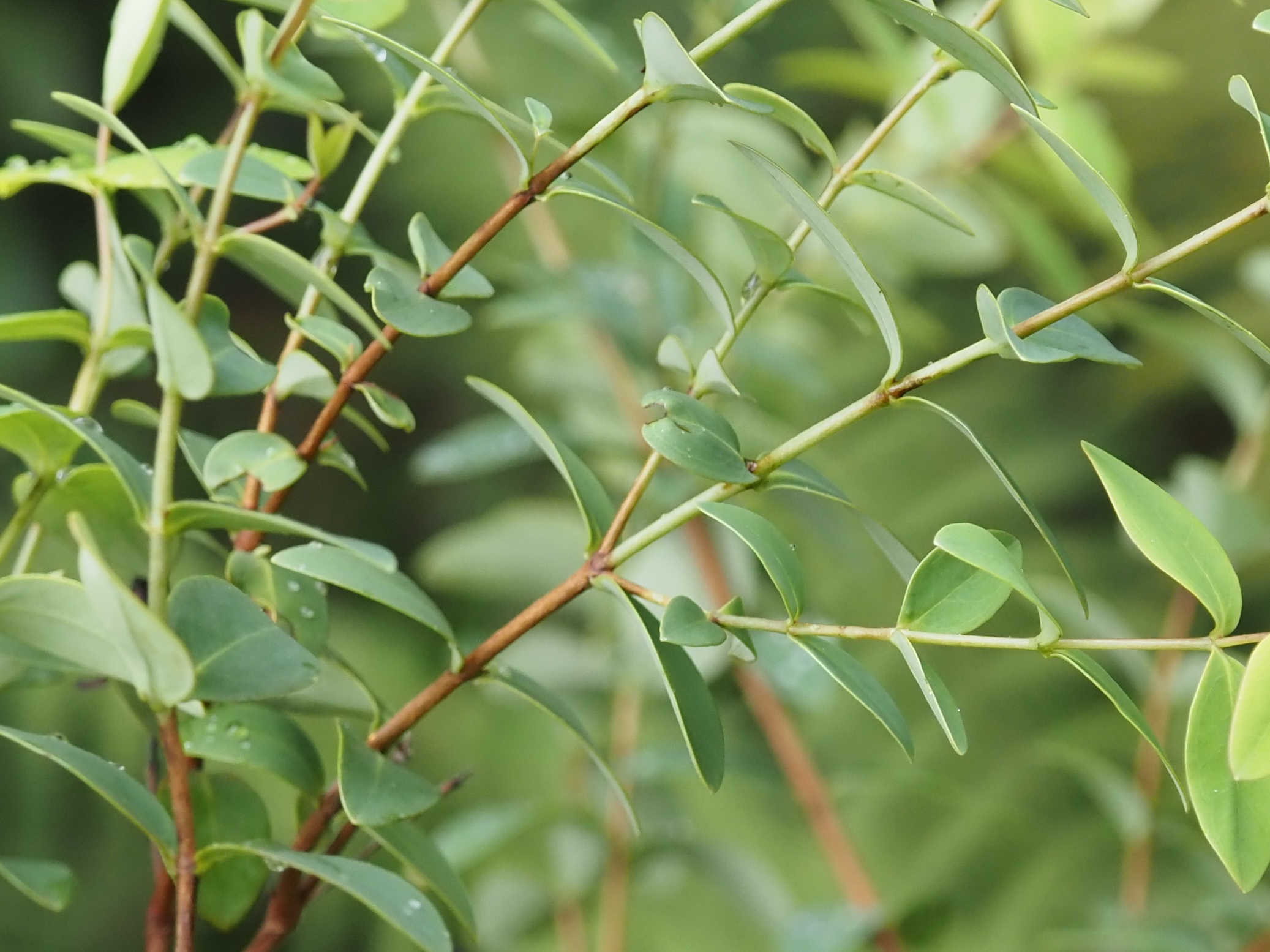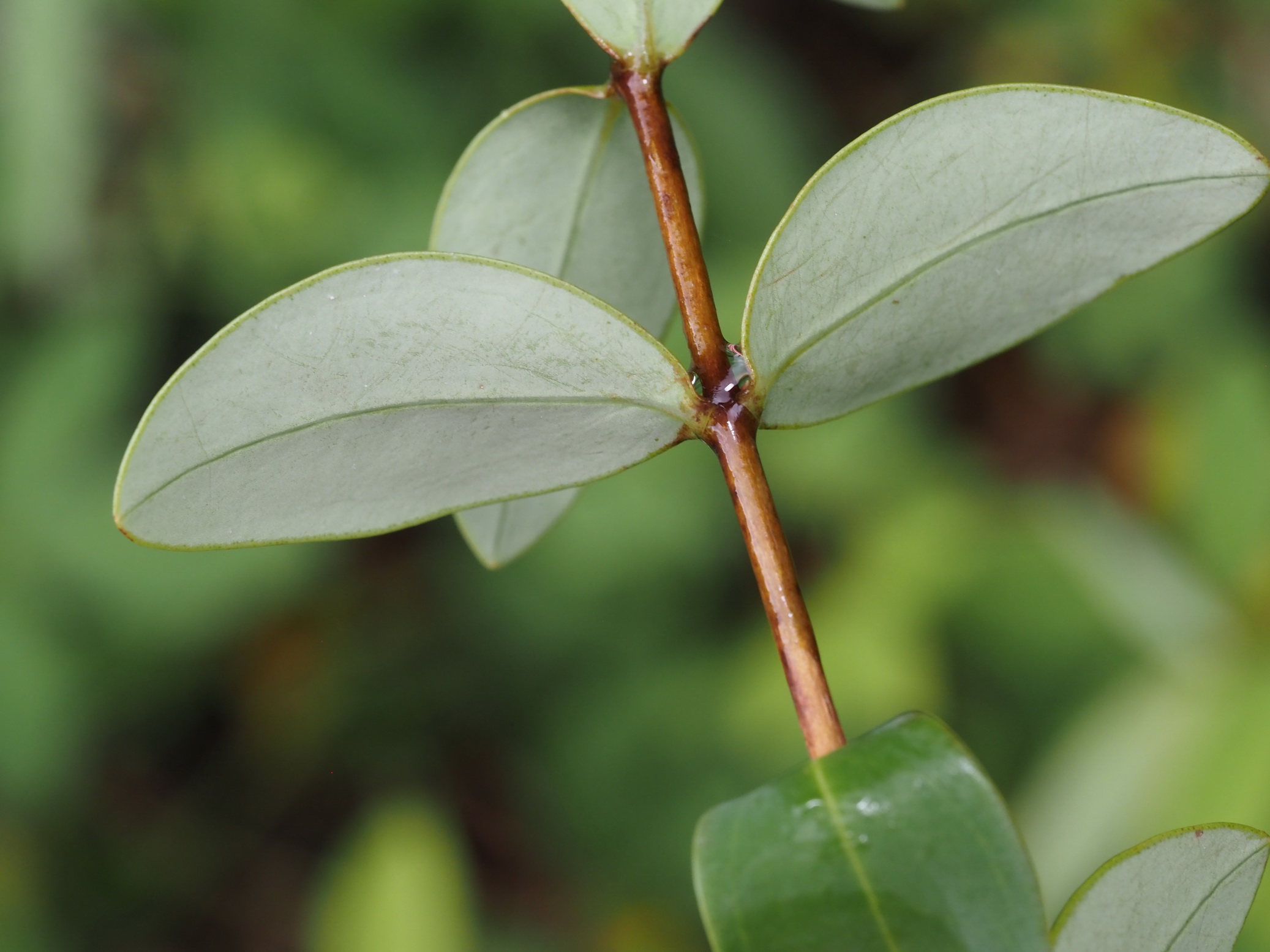 小灌木,成熟枝條紅褐色,圓形柔軟,小枝常平伸或下垂。單葉對生,卵形至橢圓形,全緣無柄,網紋極不明顯,腺體除葉背葉緣外,少或不明顯。