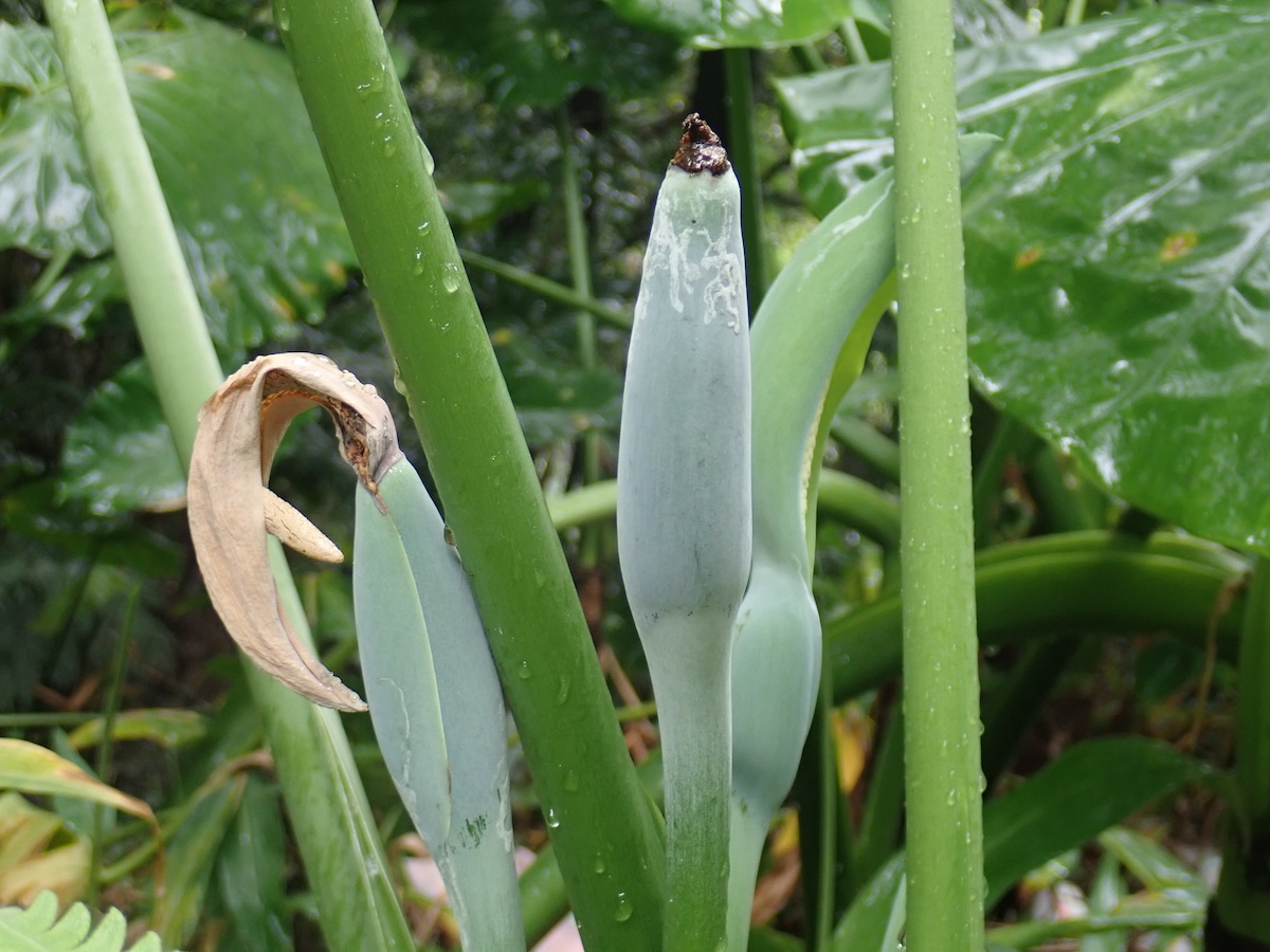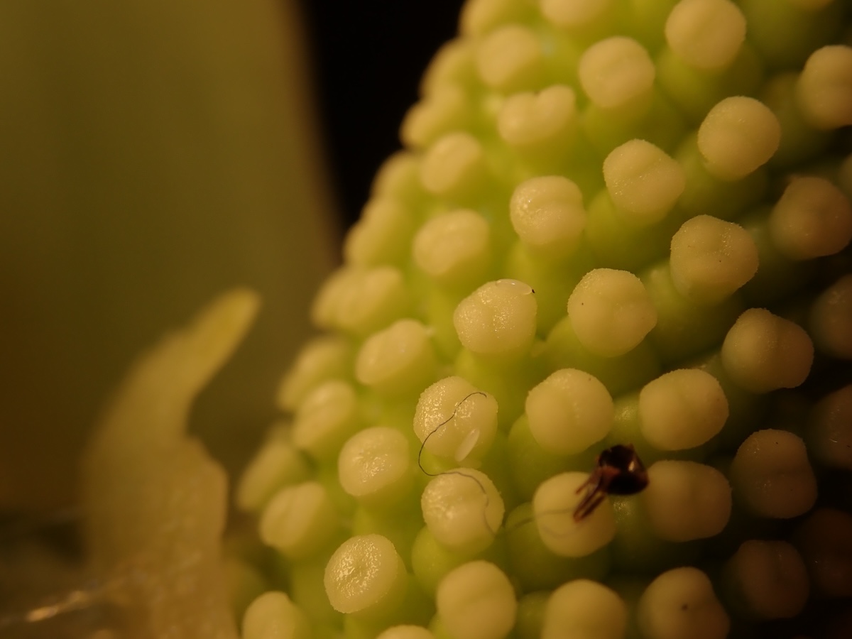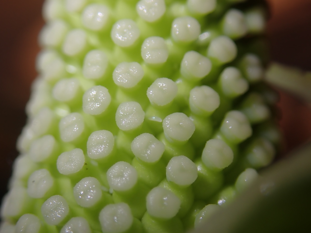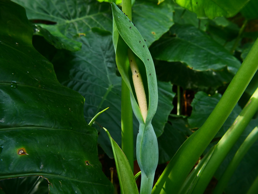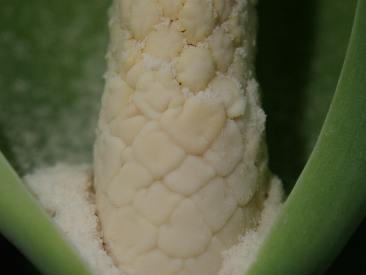 進入開花期時,可見綠色佛焰苞,裡面有肉穗花序;雌花序在最下方,柱頭偏白色,中央為不孕花,雄花序在上淡黃色,雄熟期可見擠出的花粉,最尖端是附屬器。