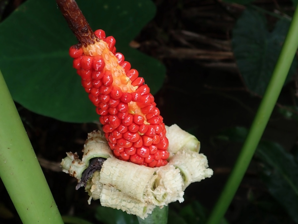漿果球形,紅色,具少數種子,姑婆芋漿果是鳥類和許多動物的食物。