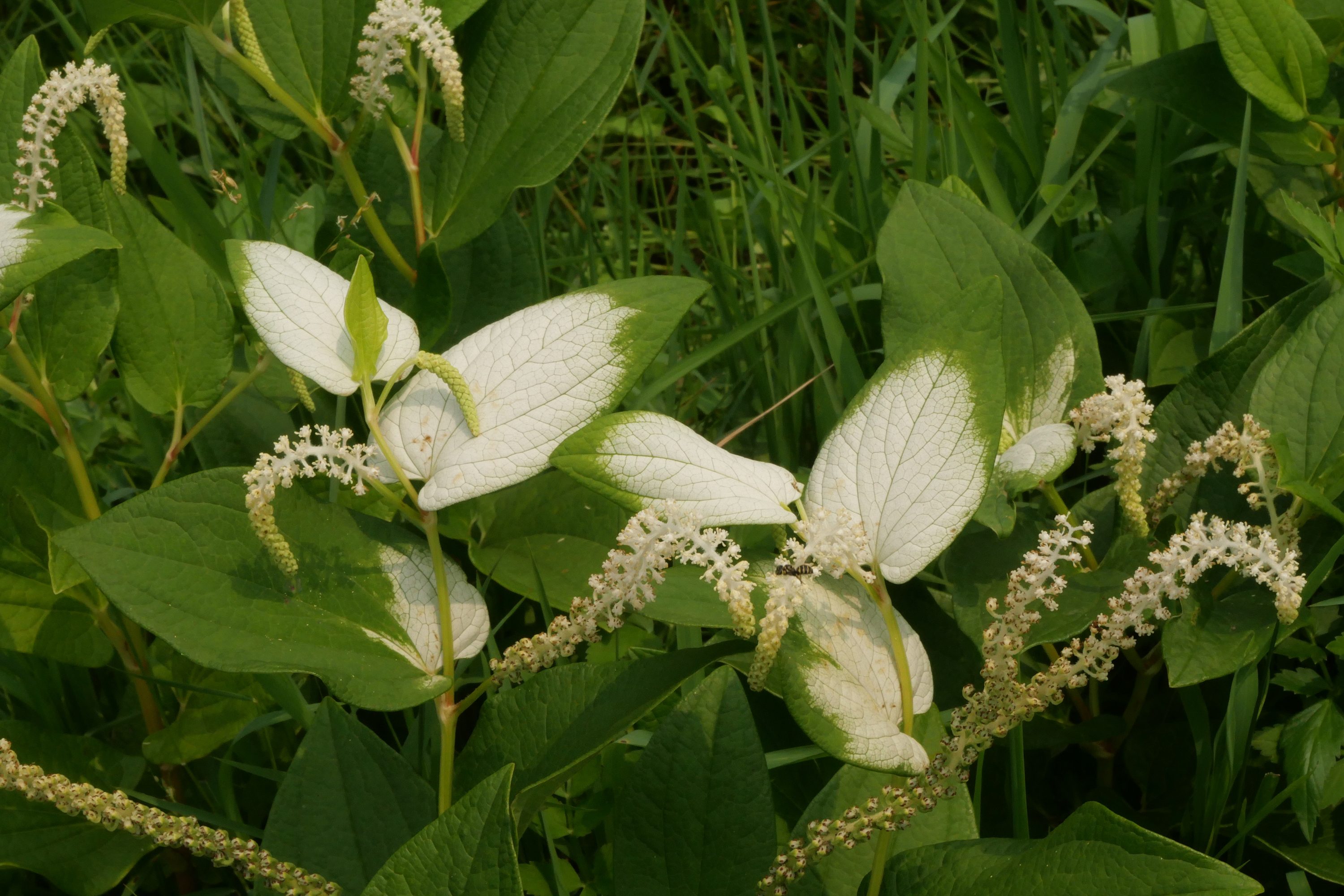 三白草屬多年生草本植物,高約30~100公分。快到開花期時,原本著生於植株頂端上的2~3片的綠色葉片會轉為白色,或綠色和白色各半,因此被命名為三白草。