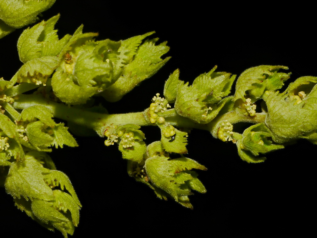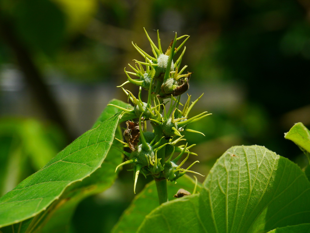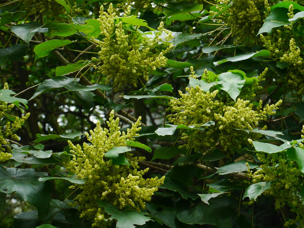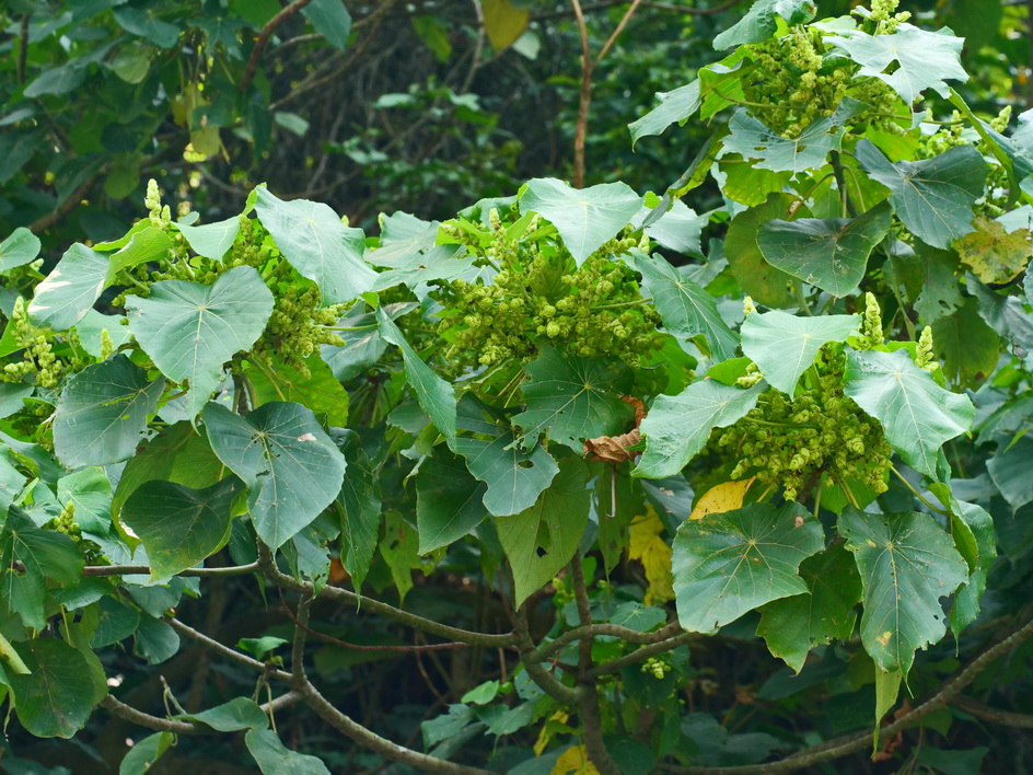 血桐的莖小枝及葉柄被有白粉,葉為單葉互生,盾狀、紙質,叢生(簇生)於枝端,樹冠呈傘狀。花黃綠色,腋生無花瓣,雌雄異株,總狀花序或圓錐花序排列;蒴果帶有軟軟的凸刺像小怪物,內有2~3顆黑亮種子。