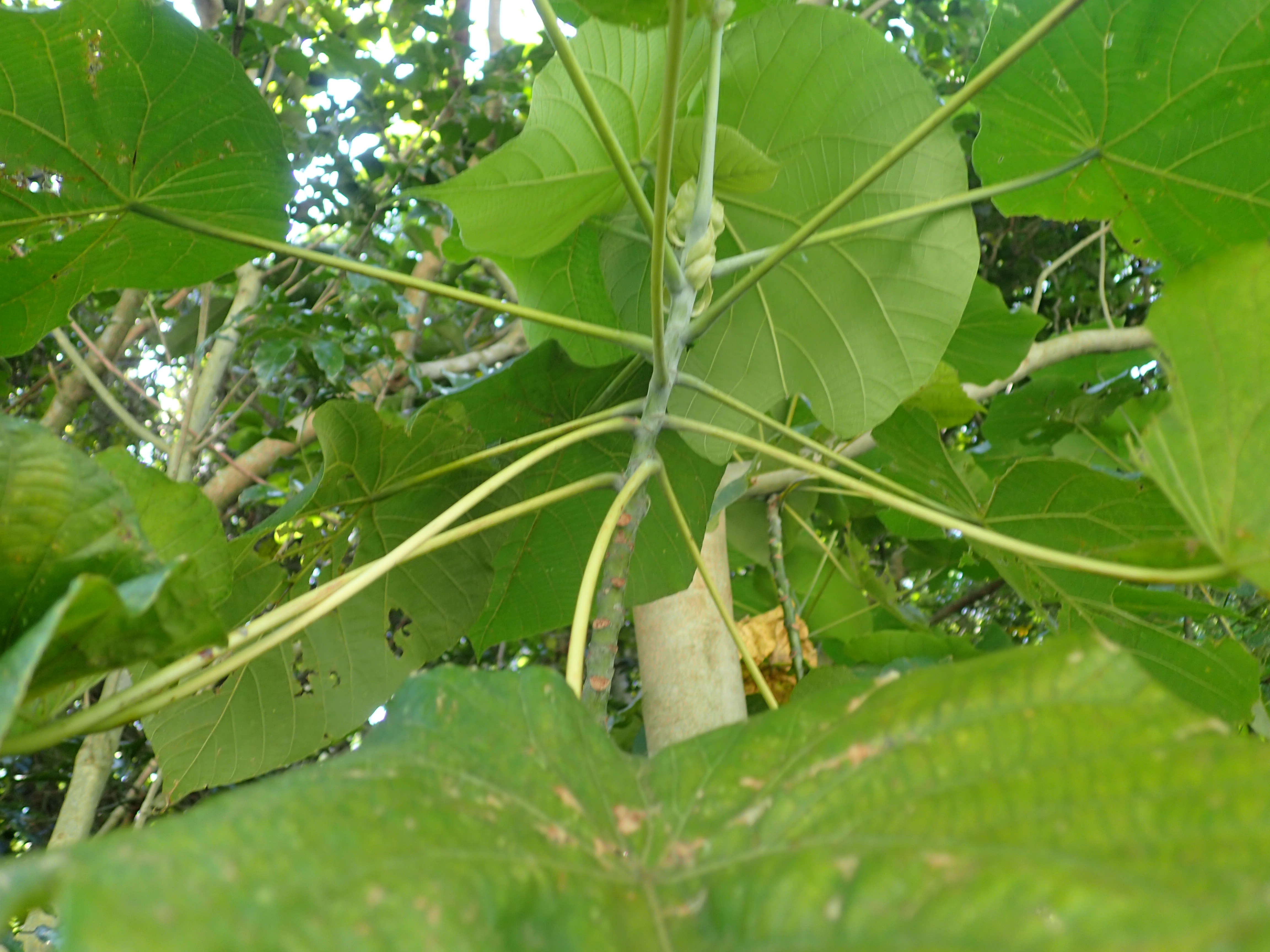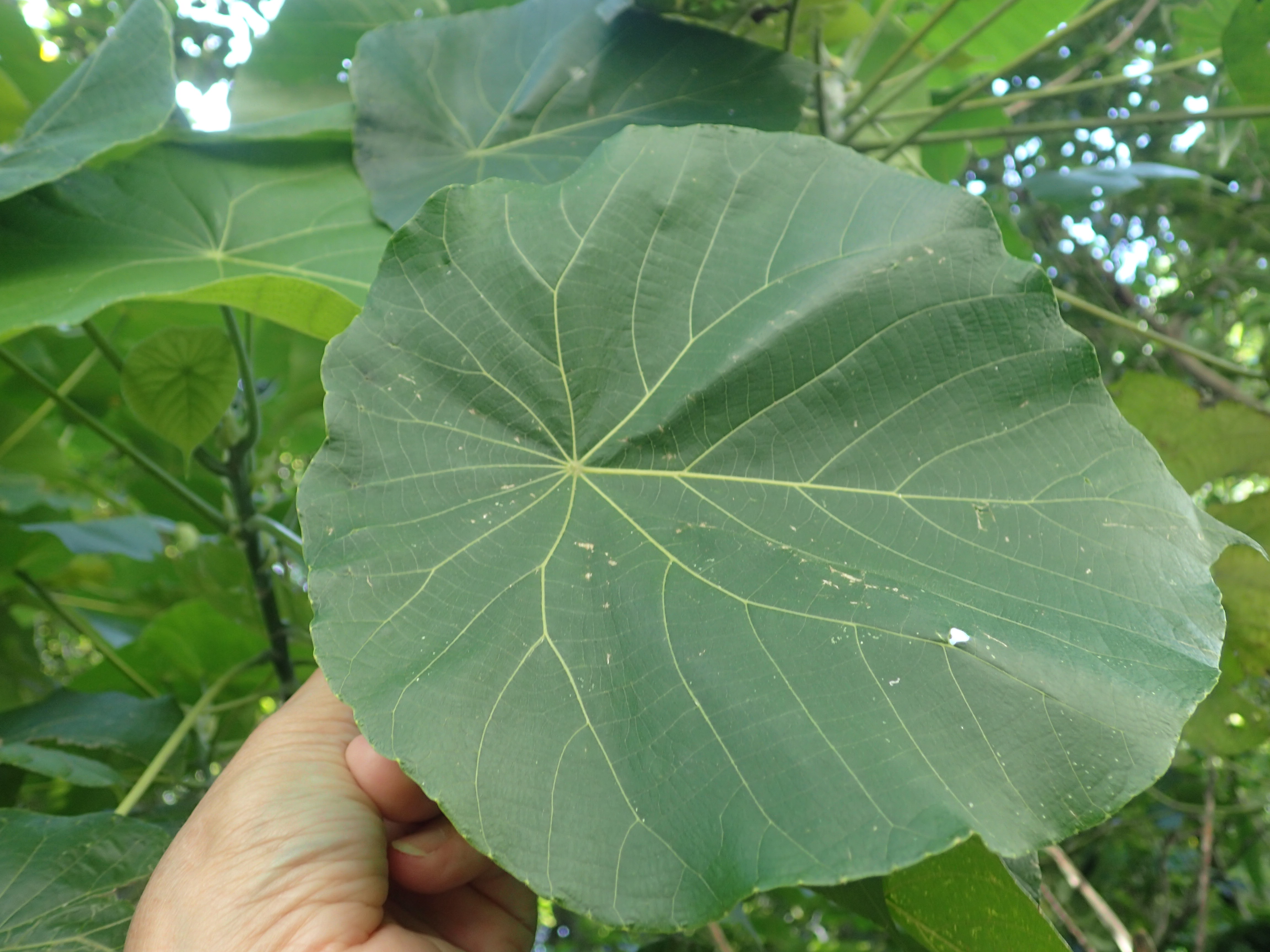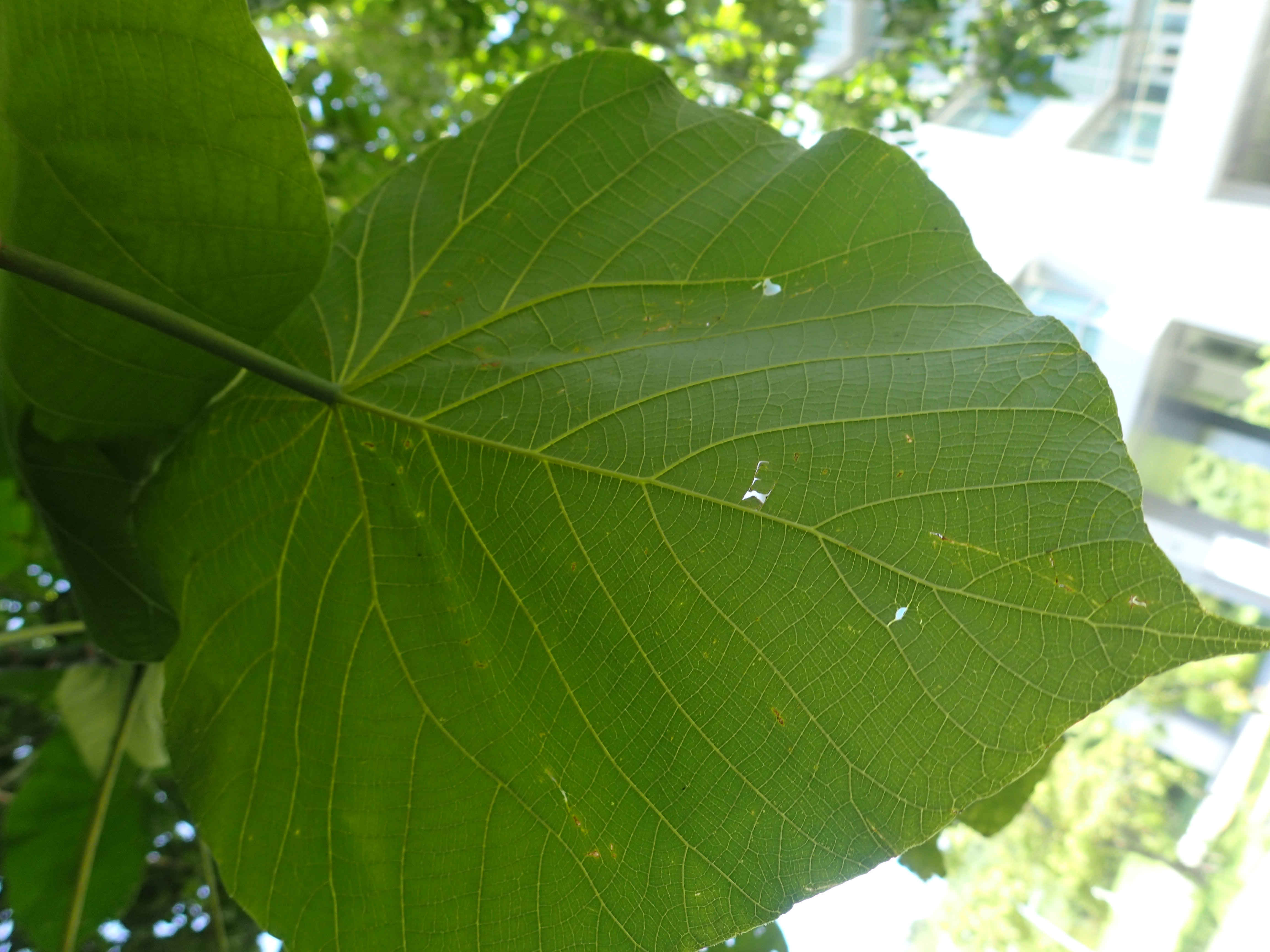 血桐為吸收大量的陽光,葉片拼命往上長,遠看如同一把大傘,提供鳥兒和動物良好的遮蔭,也可用於遮蔭樹或美化庭園栽培。葉片像盾牌,直徑可達30公分,仔細看又很像大象的耳朵,因此它的英文名為Elephant's Ear「象耳」。採片葉子,握住葉柄就好像撐著一把小傘。