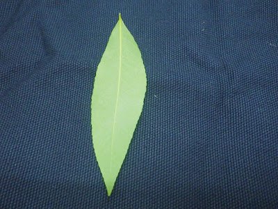 單葉互生,卵狀披針形或,長6至9公分,寬 2至3公分,先端銳尖或少數鈍,基部鈍,紙質,葉緣有細鋸齒,表面至呈有光澤綠色,背面偏白,中肋於表面凹下而於背面隆起,側脈每邊9至13 枚,葉柄長1至1.8公分,光滑無毛或近似無毛,葉柄基部有一對會脫落的耳狀托葉,葉片基部的葉柄上有腺點,特大葉的腺點會長成小葉狀。