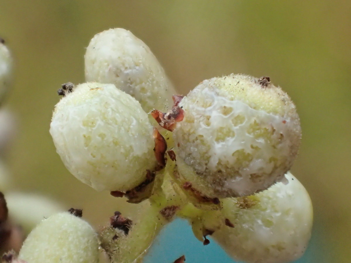 在青綠色的果實上會有雪白色的結晶體覆蓋