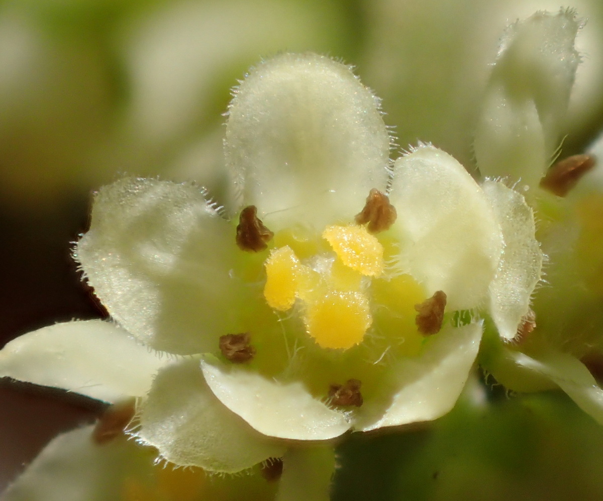 雄花,花瓣黃白色5枚,雄蕊5枚,花藥黃色