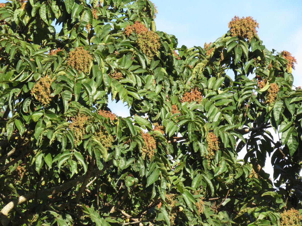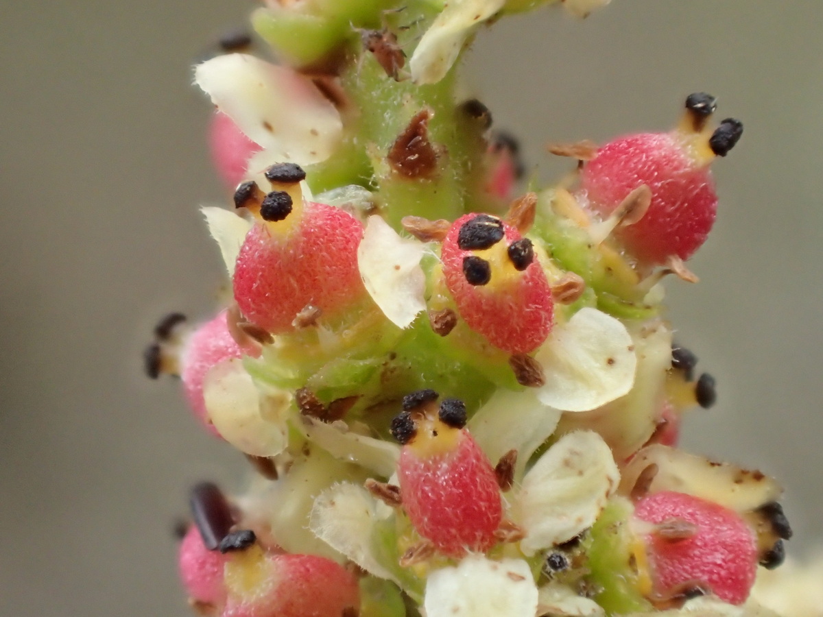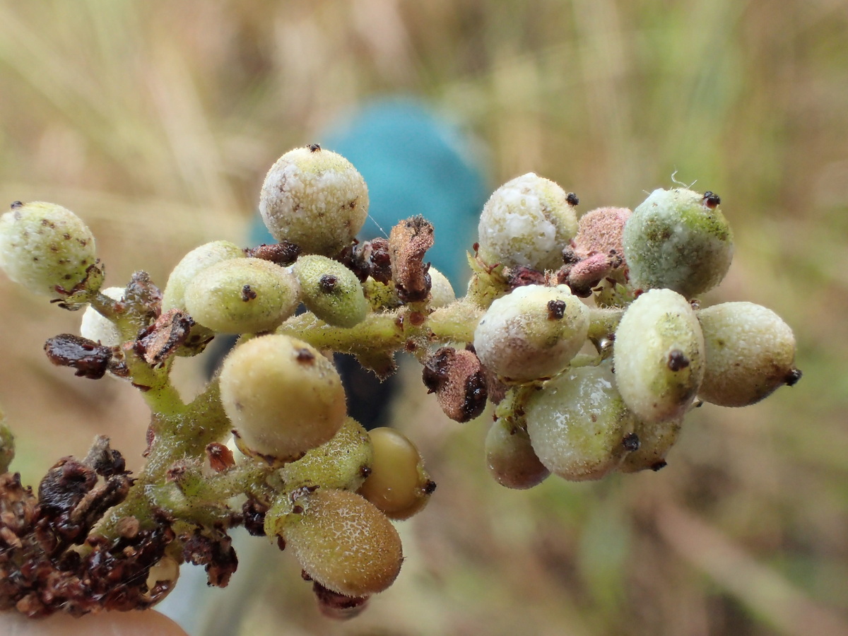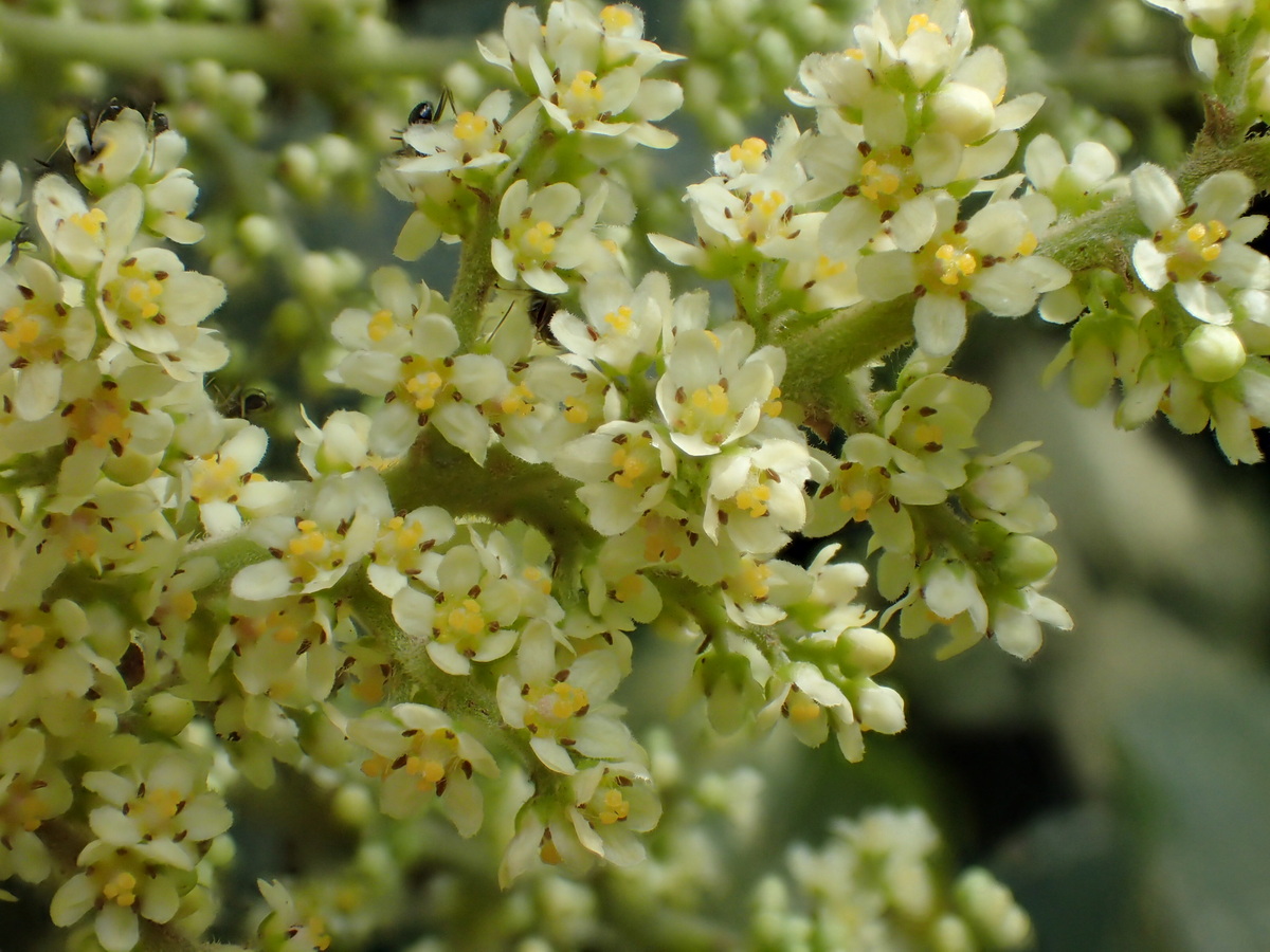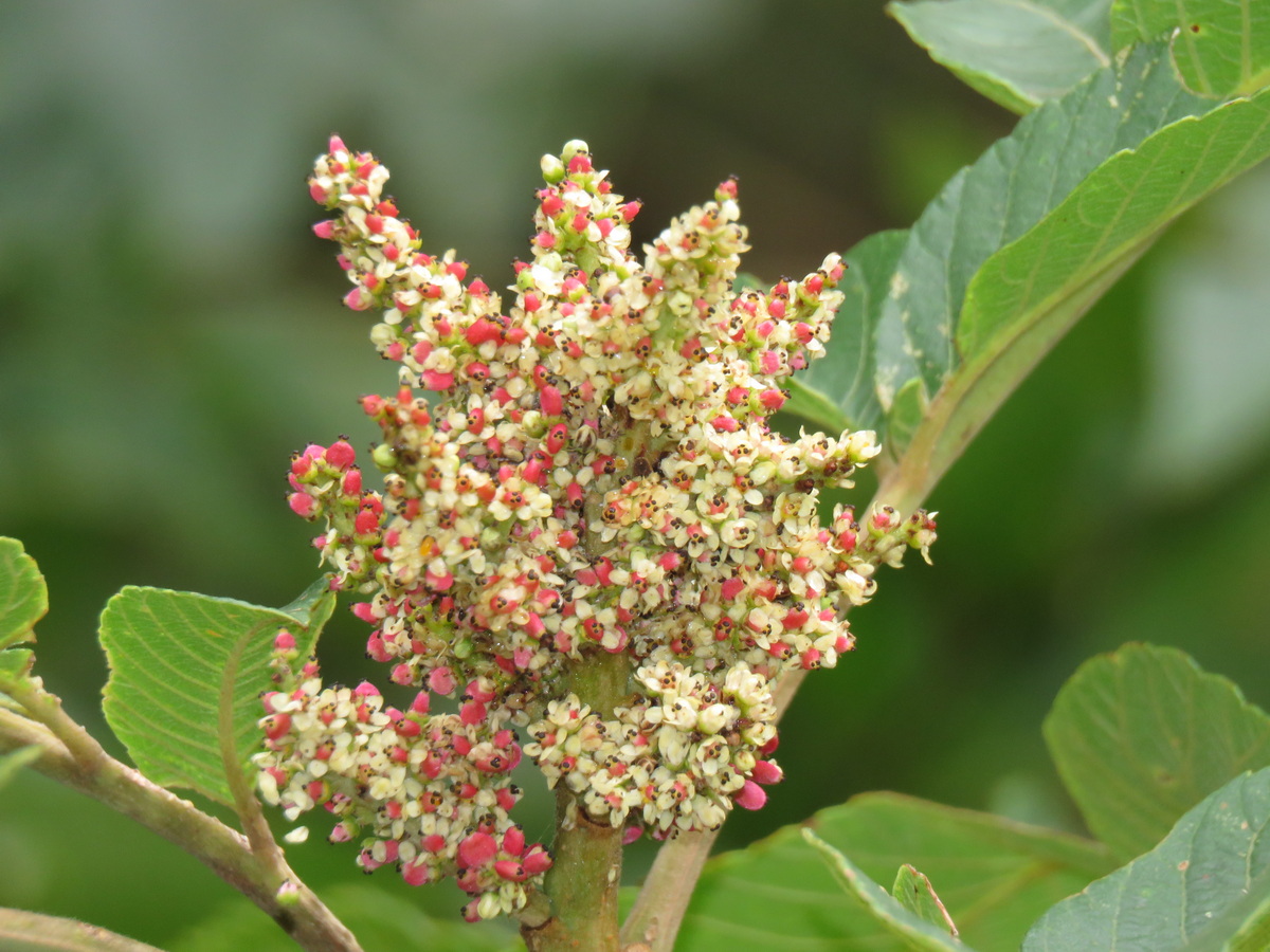 雌雄異株,花期在夏至秋季,花序頂生,花小形,多數,圓錐花序排列,花瓣黃白色5枚,雄蕊5枚,花藥黃色,可見中間的退化雌蕊,雌蕊子房白色,花柱及柱頭黃色3叉,可見5個褐色退化雄蕊。授粉後子房漸漸發育,顏色由白色轉為紅色,甚是漂亮。雌雄花朵中間的花盤都可分泌花蜜,盛花時吸引許多昆蟲前來吸蜜授粉。果實為核果,扁球形,秋季是果實的熟成時間,在青綠色的果實上會有雪白色的結晶體覆蓋,使果實嚐起來有薄鹹味。熟時為橙紅色,散生柔毛。
