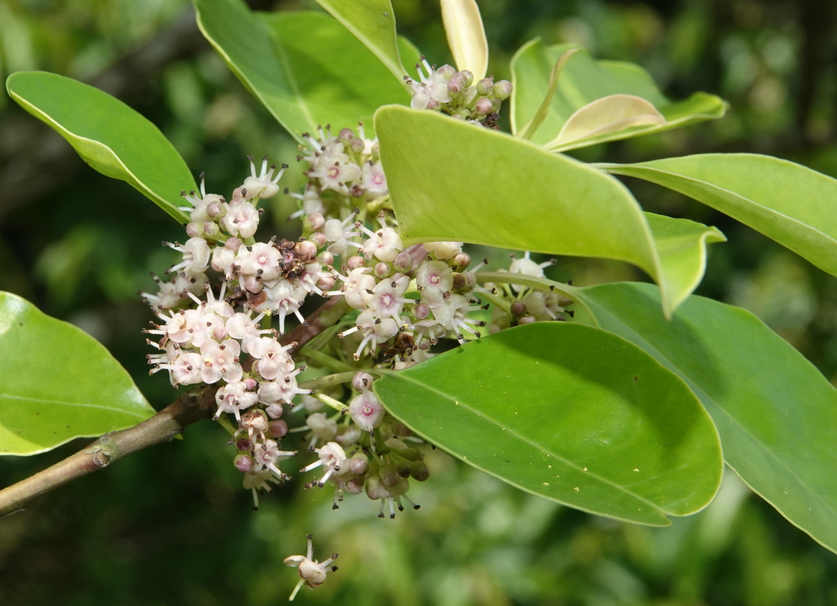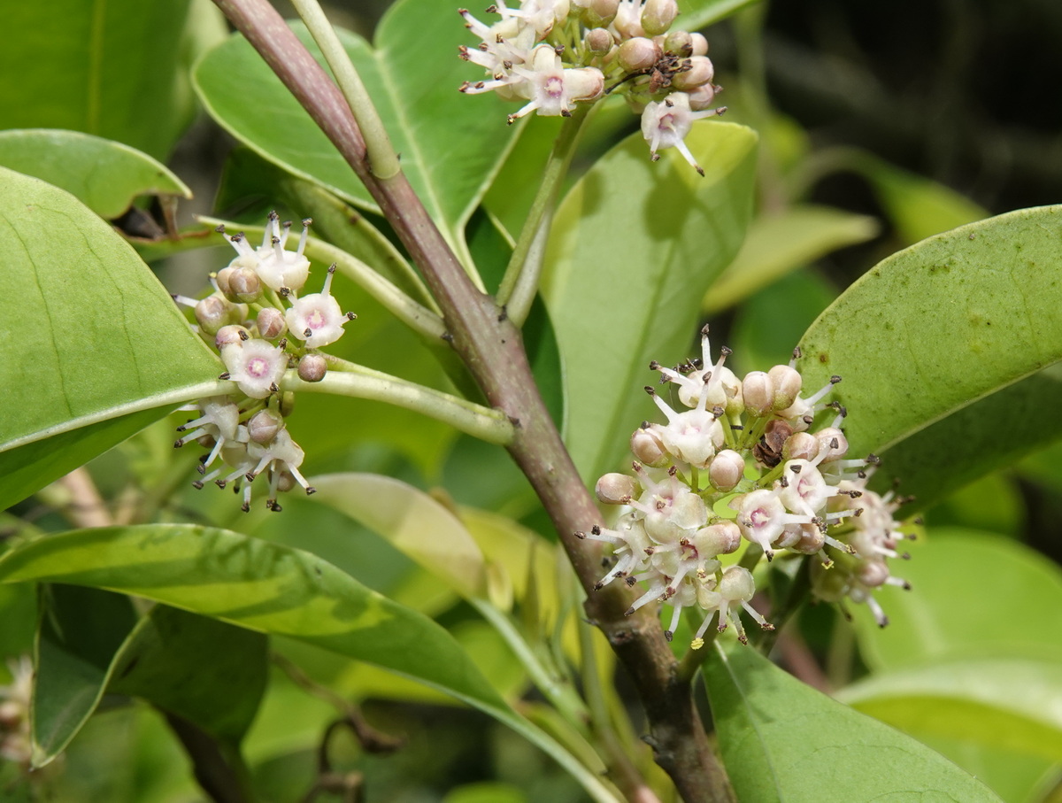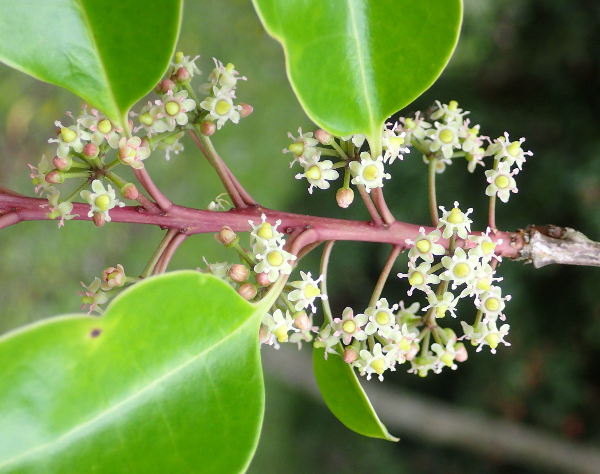 雌雄異株,花期在每年3~4月,腋出於當年新長的枝條,聚繖花序排成繖形狀。花瓣黃白色,雄花花瓣4枚,雌花花瓣5~6枚,雄花可看見退化雌蕊,花粉為黃色,雌花也有退化雄蕊,5~6枚,盛花期有蜜。果實為漿果狀的核果,橢圓形,發育期為綠色,果熟期為10~2月,熟果為紅色,有光澤,內有1~2顆稍大於米粒扁而有4條稜脊的種子。