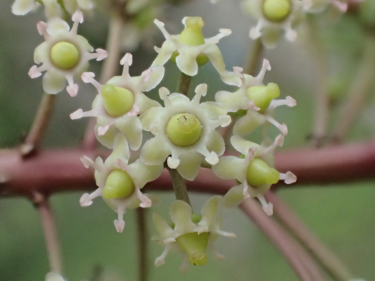 雌花序,聚繖花序排成繖形狀,腋出於當年新長的枝條