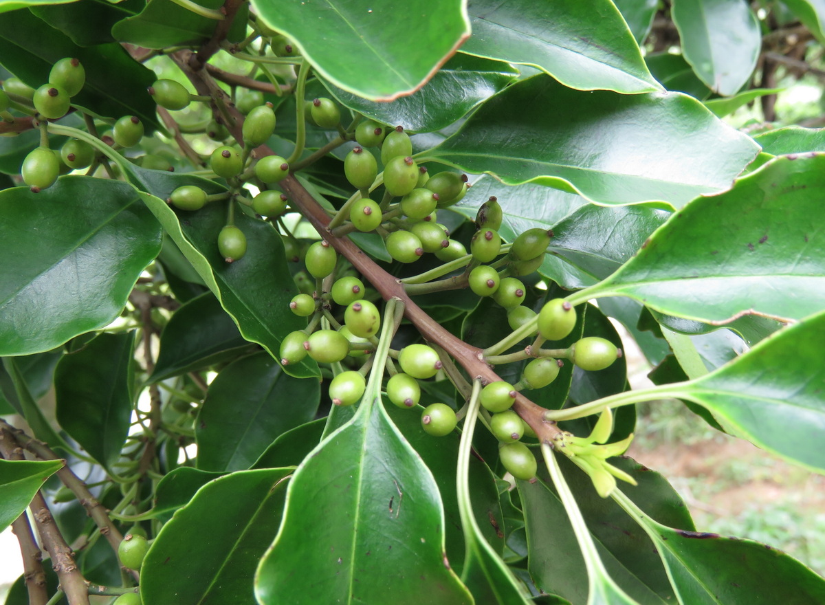 國家生技研究園區開放區裡有一棵雌的鐵冬青,每年都有結果,秋冬季節常能看到綠葉中露出一串串的紅果,有種過聖誕節的氛圍。可惜,沒有捕捉到鳥兒前來覓食的畫面。在生技園區保護區(溪流區)裡有一棵雄的鐵冬青,每年開完花之後,就這以一身的綠葉過完整個秋冬,沒有紅色的果實來點綴。這棵雄的鐵冬青特別受到黑腹虎頭蜂的青睞,三五成群的前來刮取樹皮,這樣的破口滲出一些汁液,在夜晚時吸引一些昆蟲來覓食,倒成為蛙調時我們觀察拍攝的生態畫面。