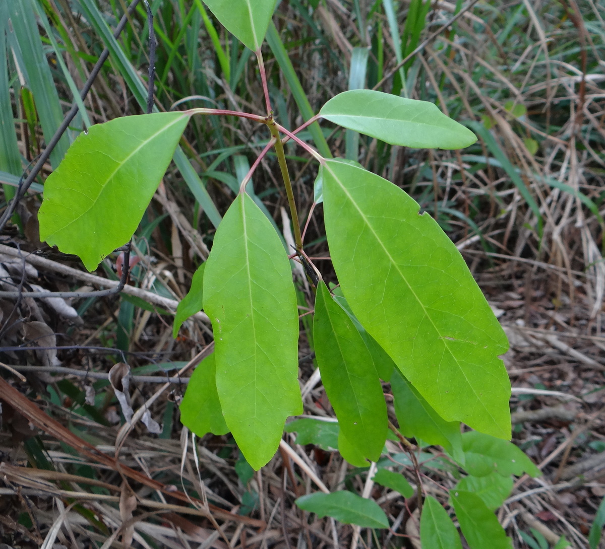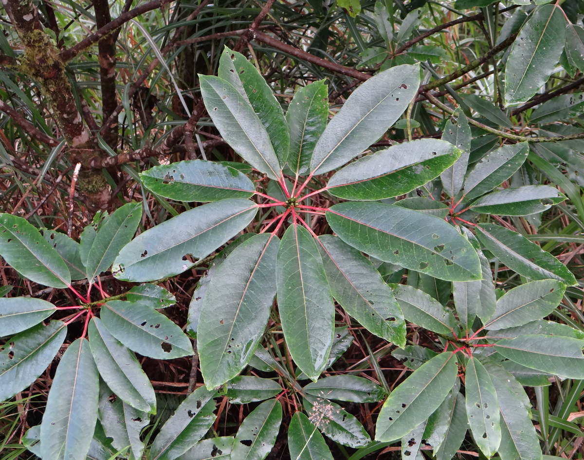 樹葉通常叢生於小枝條先端,葉柄為紅色,圓柱形,有溝紋,葉形為橢圓形,全緣,表面深綠色,葉背帶灰白色,網脈清晰可見。幼株的葉緣會有不規則鋸齒狀,春天長出的新葉是紅色的。