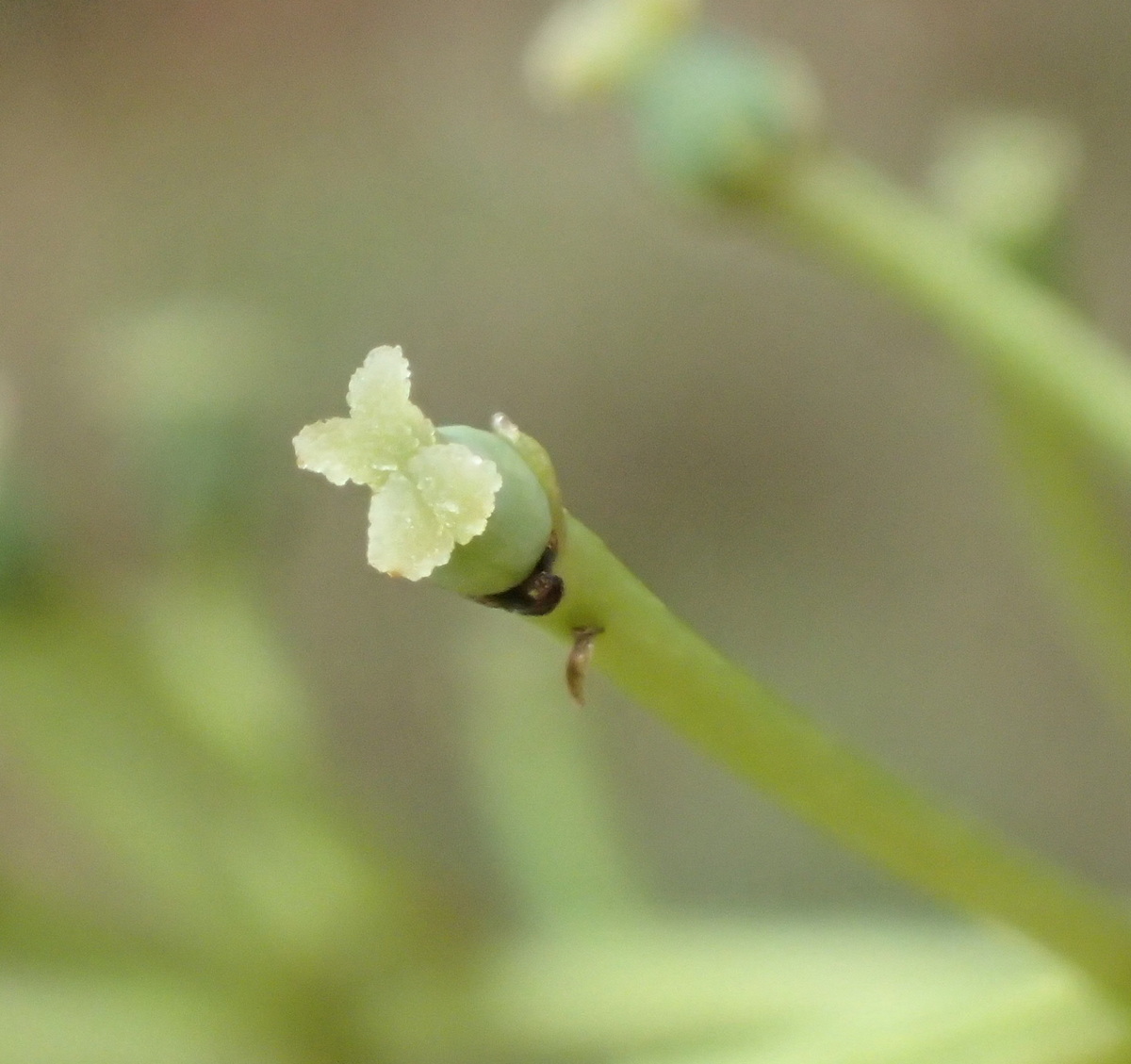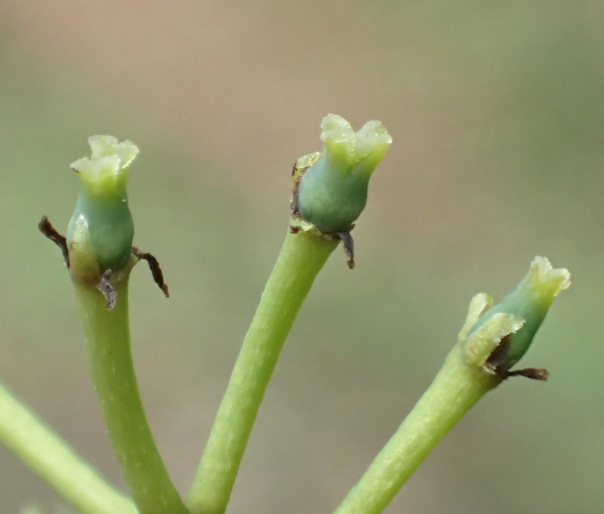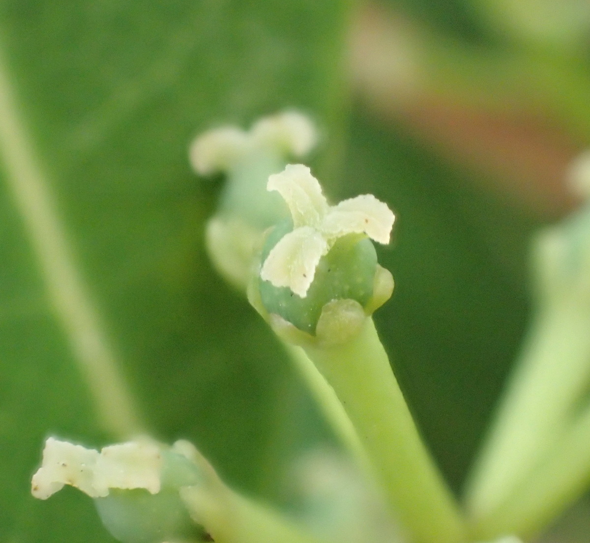 雌花可見頗長的綠色花梗,有5枚綠色花萼