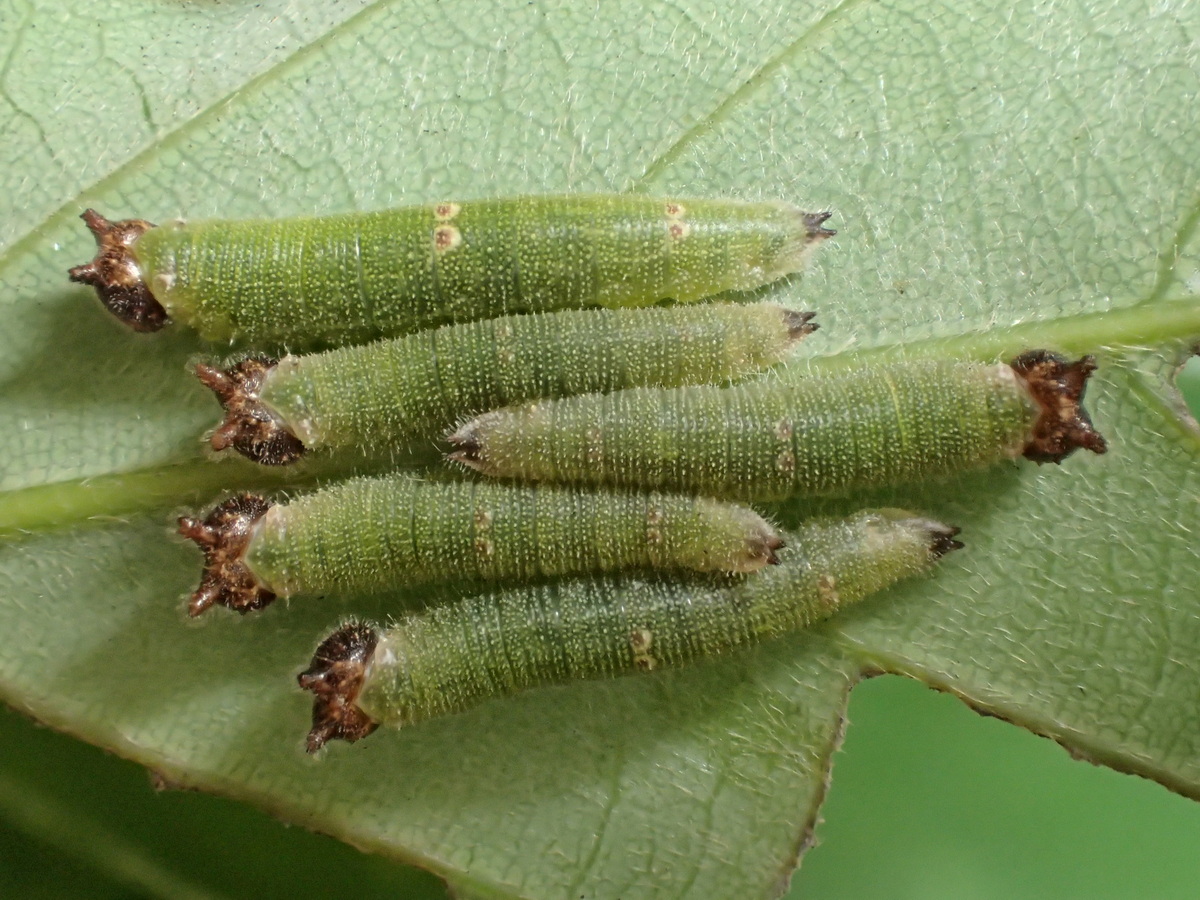 日本紫灰蝶幼蟲取食青剛櫟的嫩葉 |