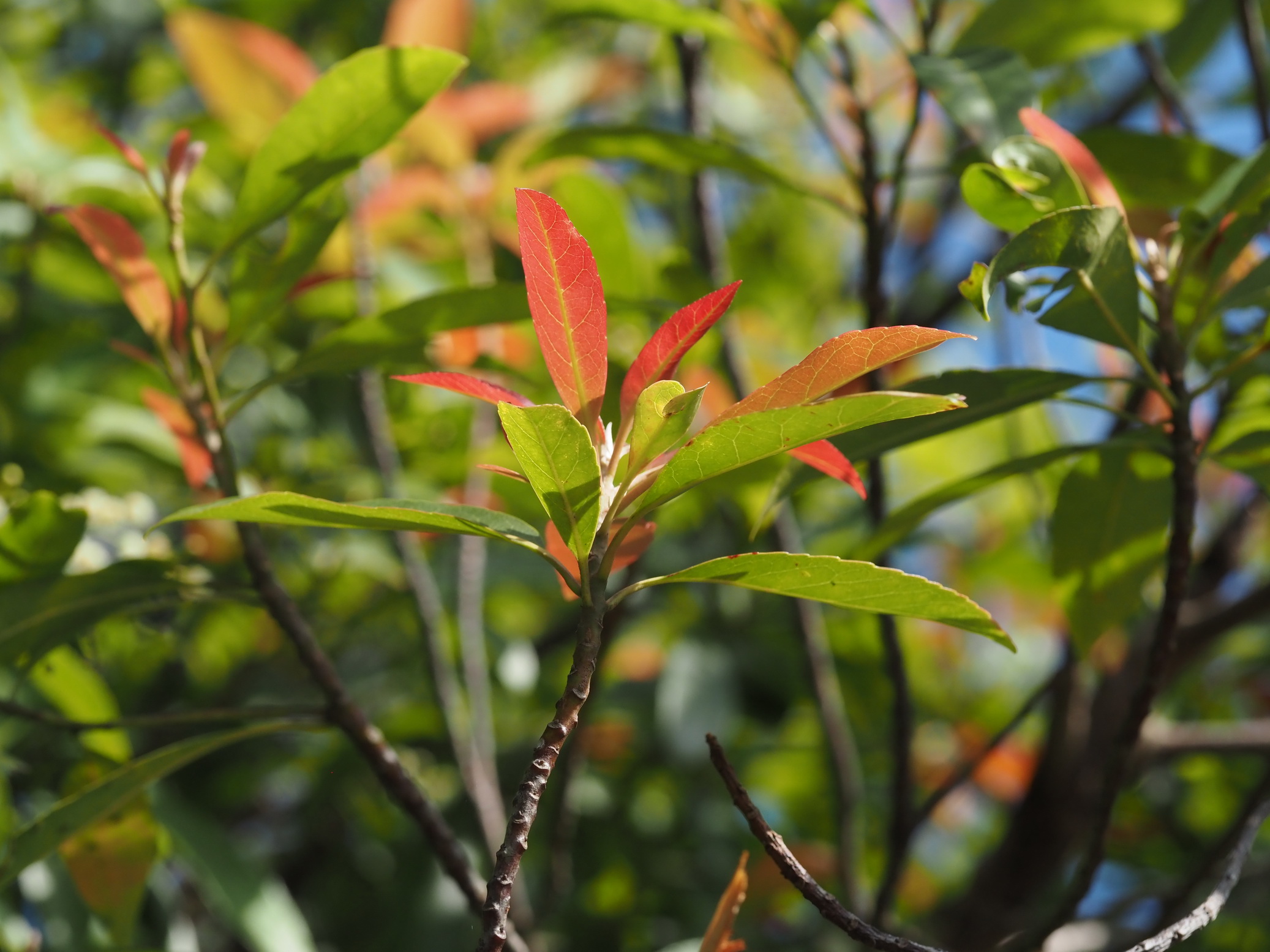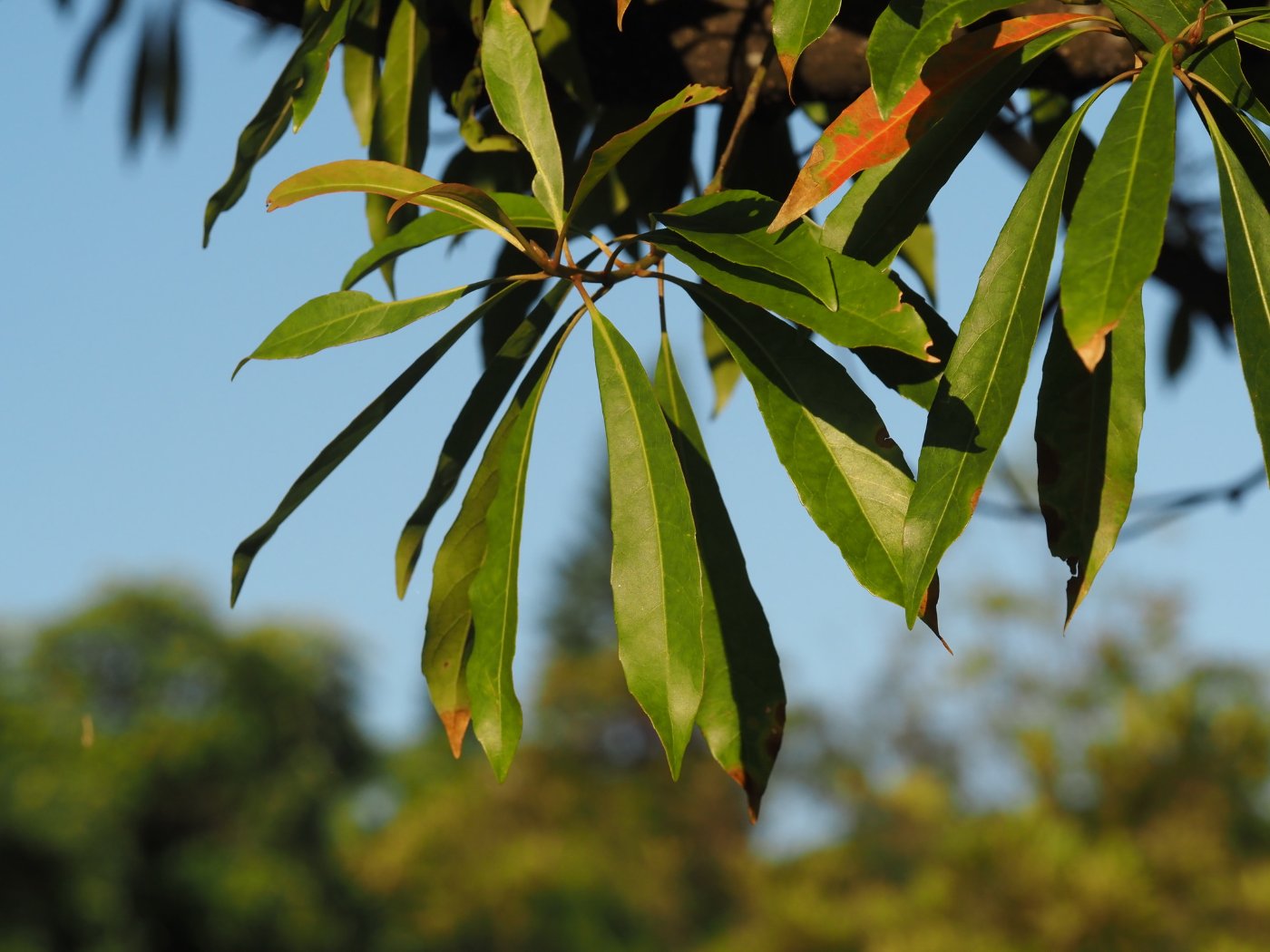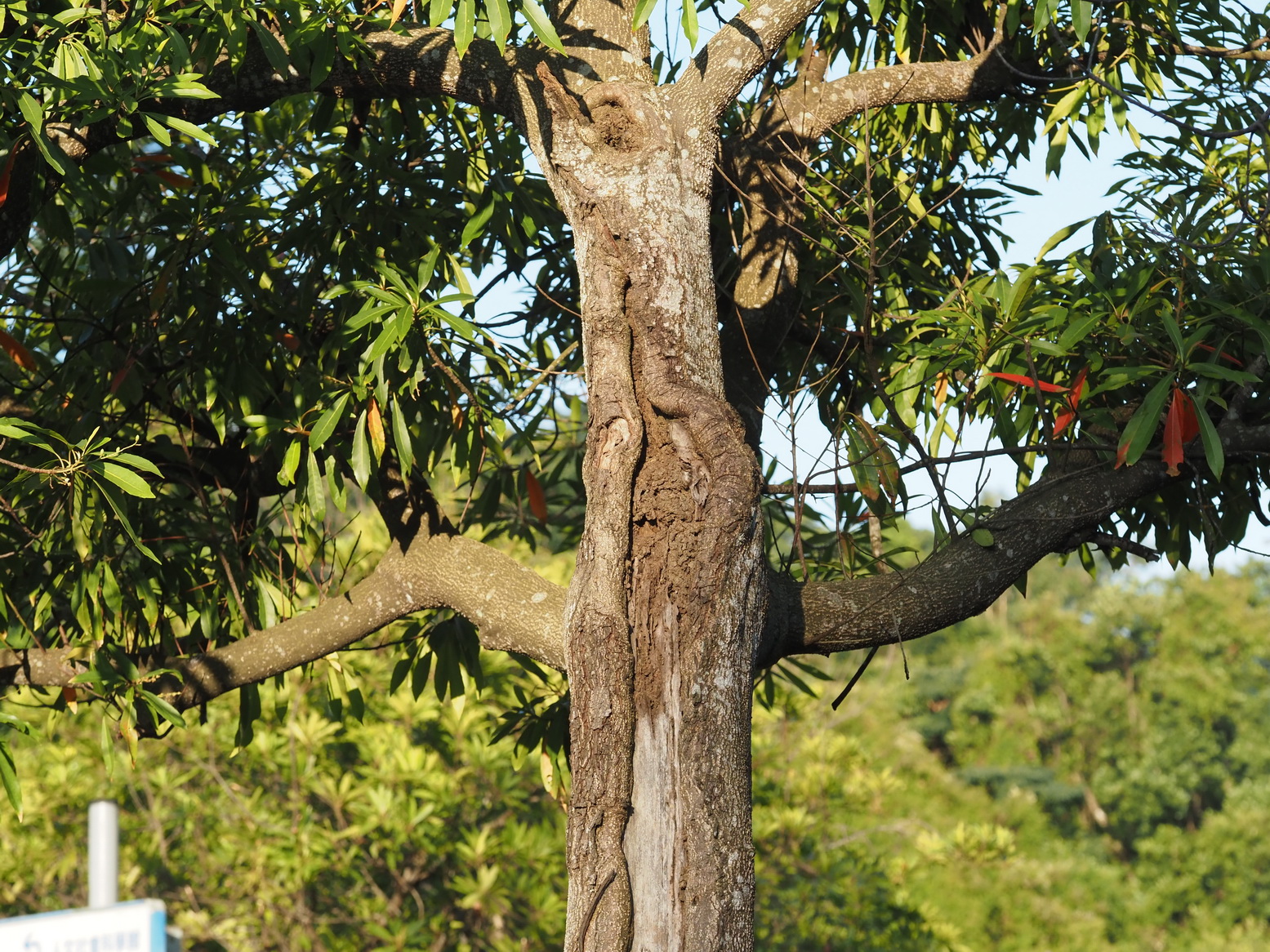 常綠喬木,單葉,互生,長橢圓或披針到倒披針形,鈍鋸齒緣,葉柄基部膨大(葉枕),整株會有零星分布的紅葉。