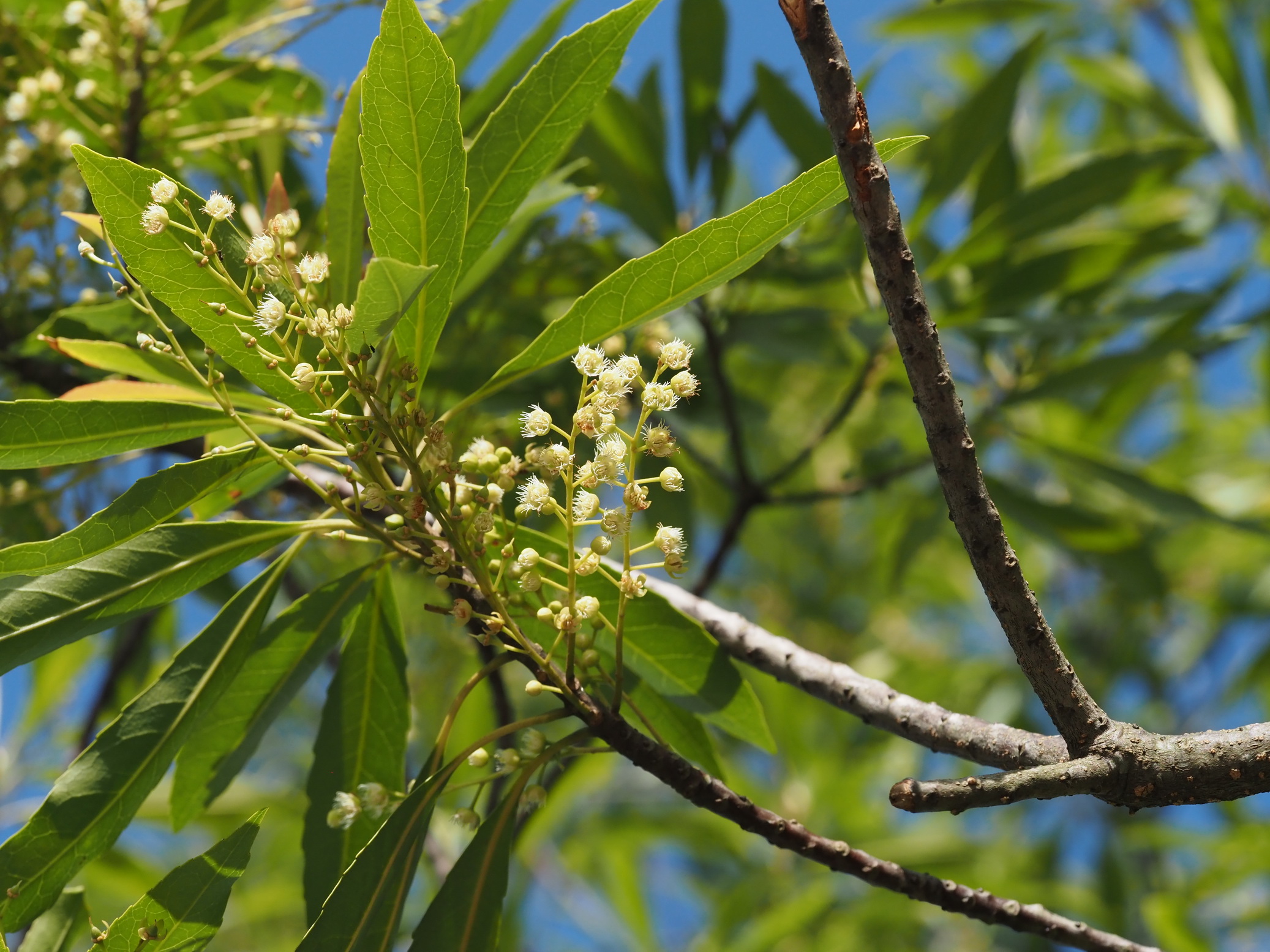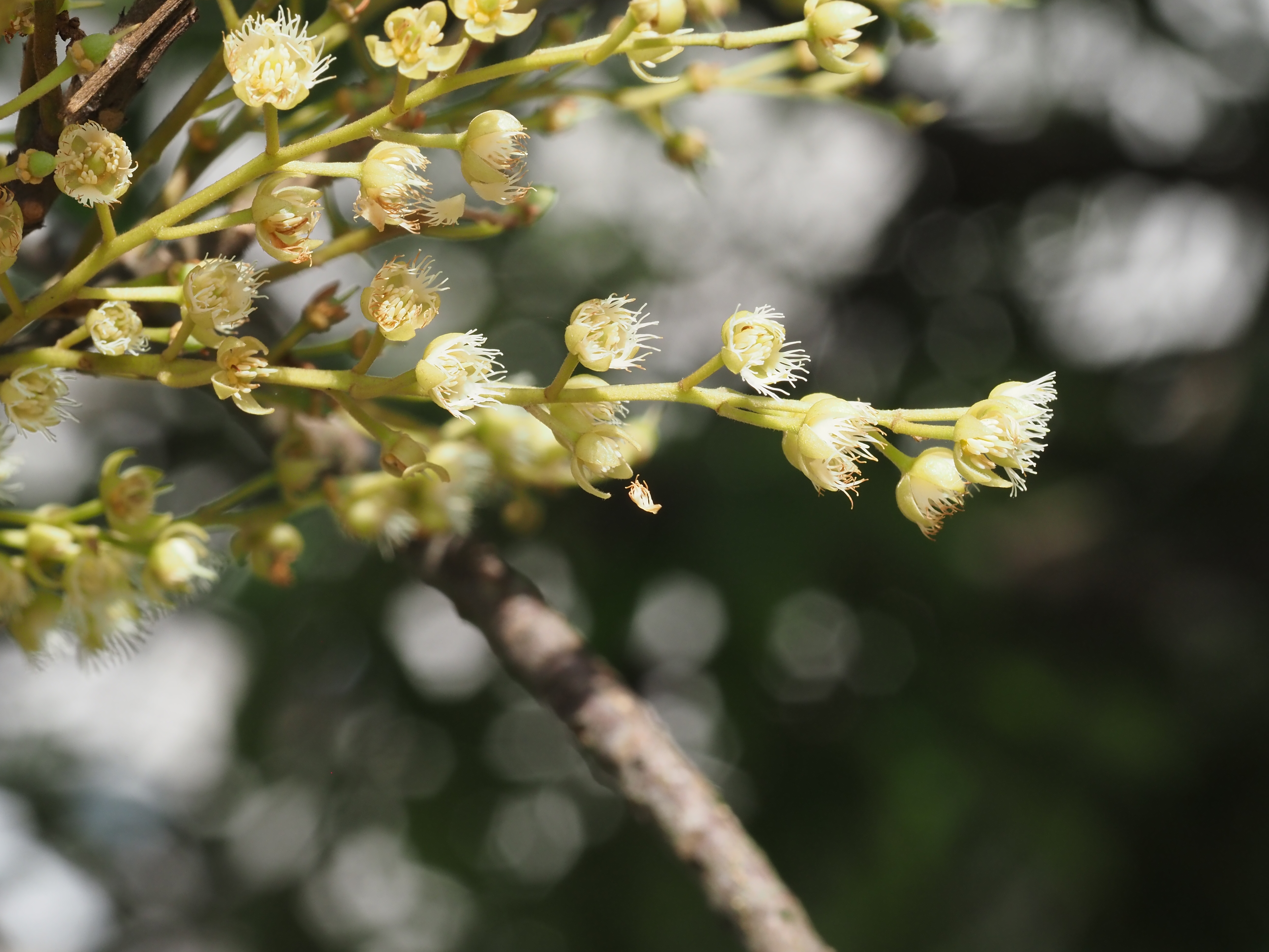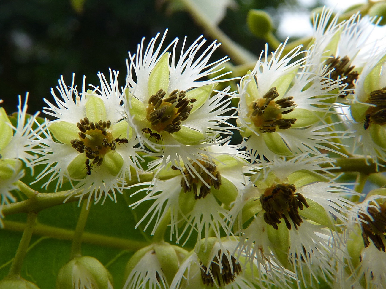 兩性花,總狀花序腋生,萼片5,離生,綠色,花瓣5,白色,頂端會裂成絲狀,雄蕊20-30,常成叢而與花瓣對生,花藥線型,頂端孔裂,雌蕊子房3室,花柱細長。花期6-9月。核果,橢圓形。
