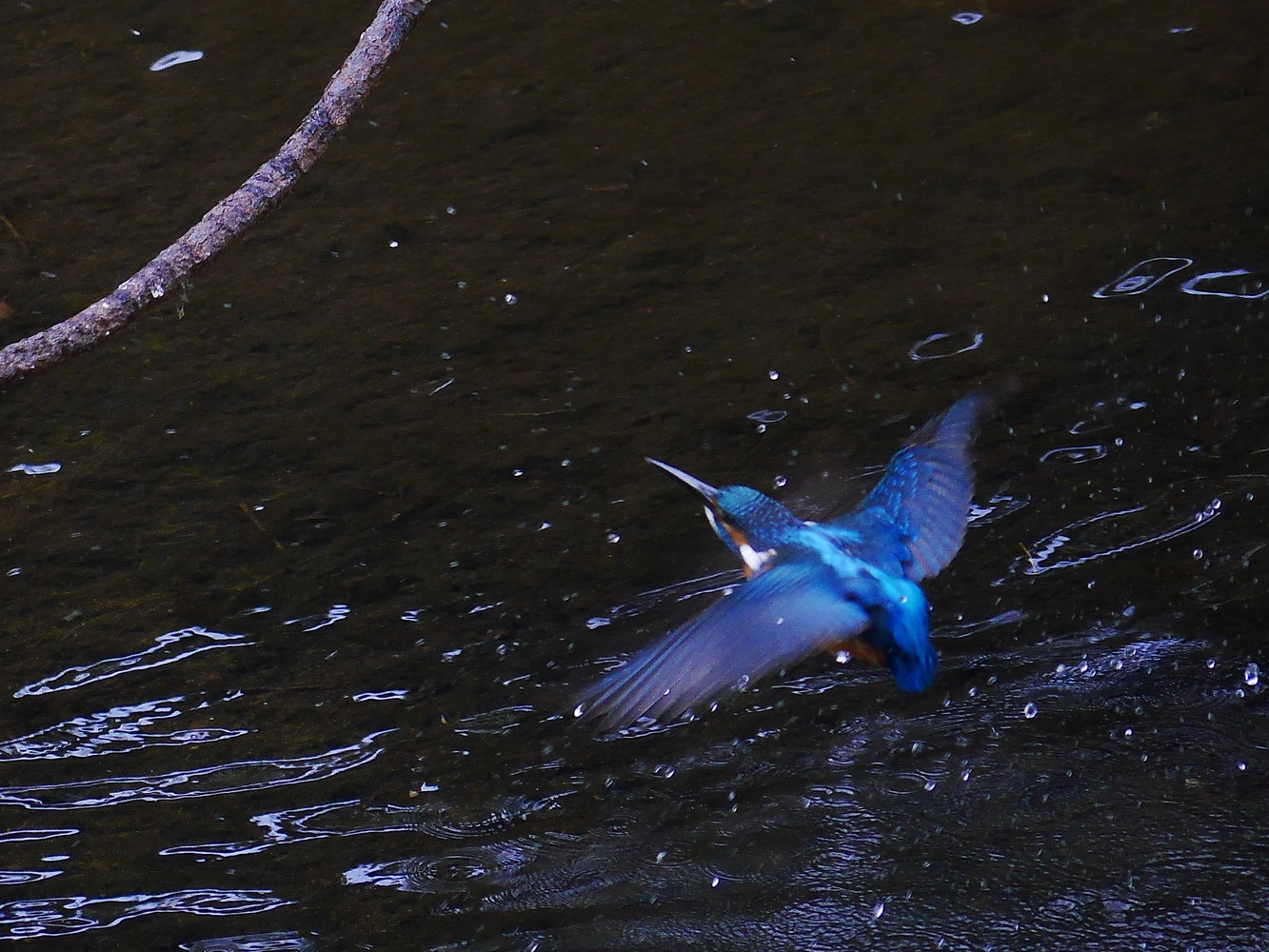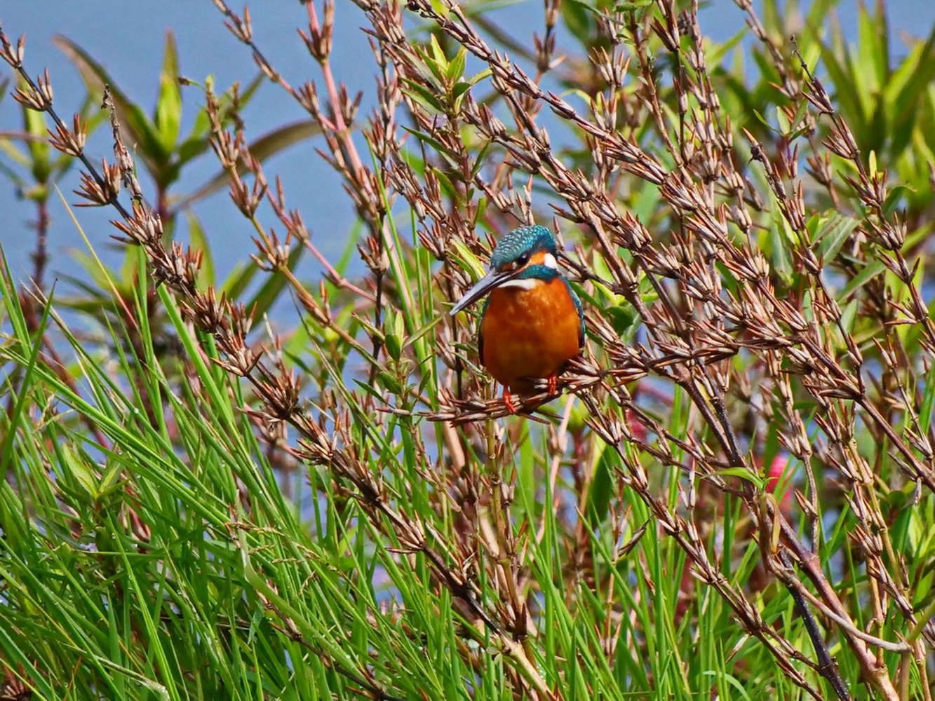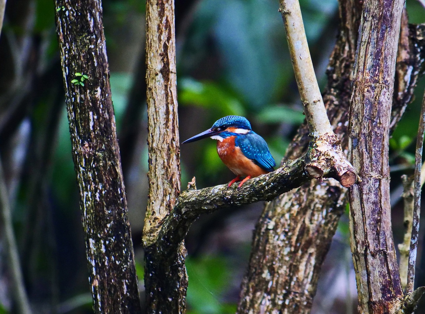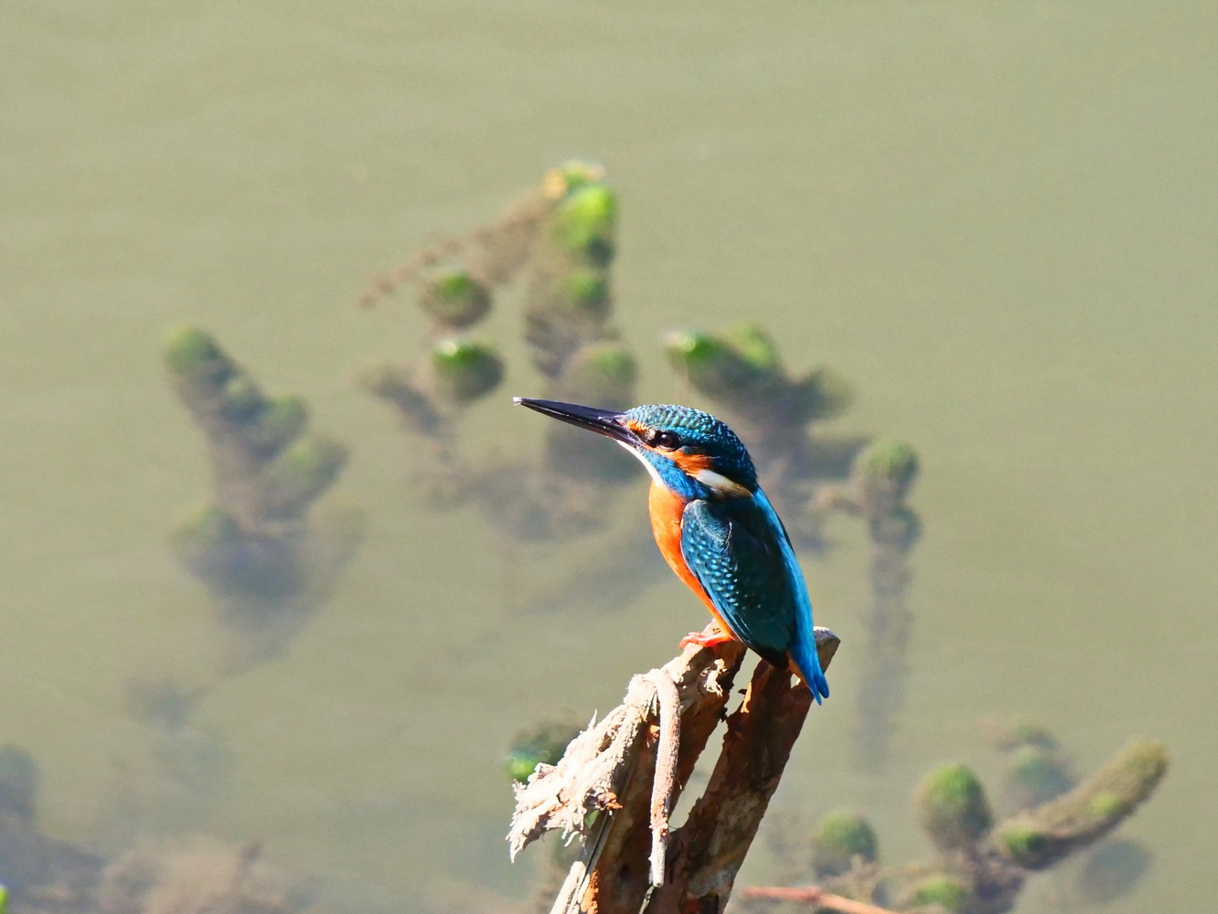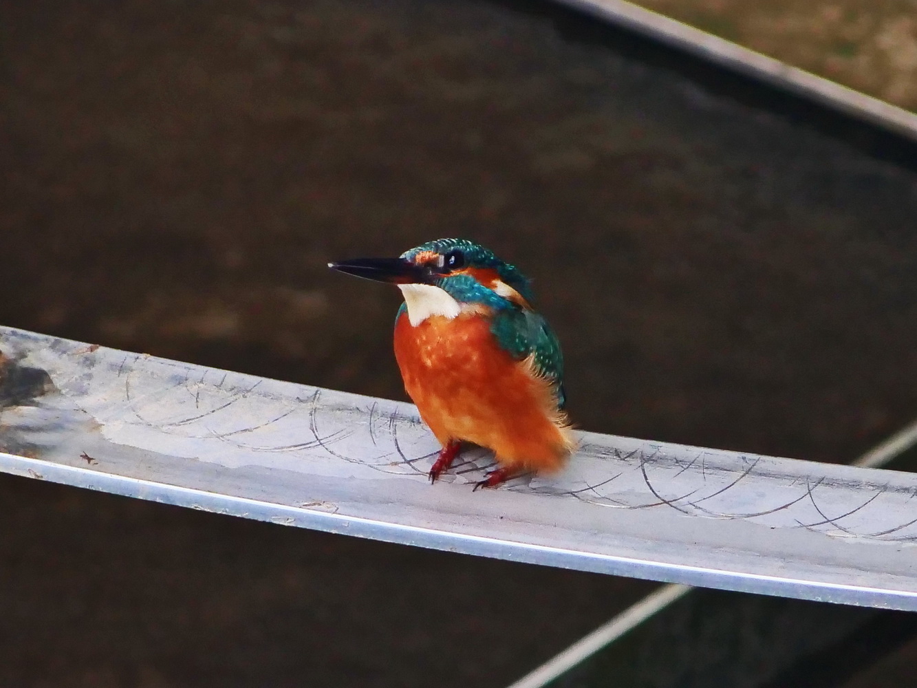 翠鳥停棲於園區攔水壩下的鐵架伺機獵魚