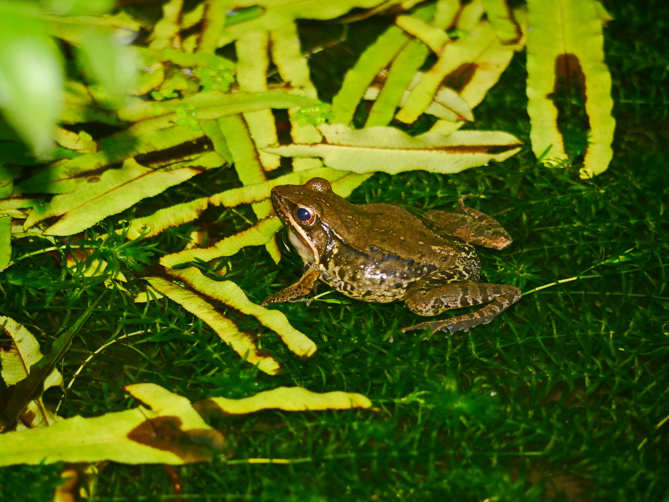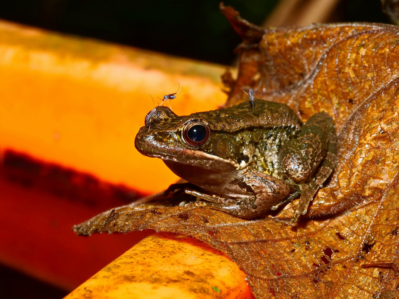 腹斑蛙眼部被蚊子叮,背側褶明顯,鼓膜周圍無白圈