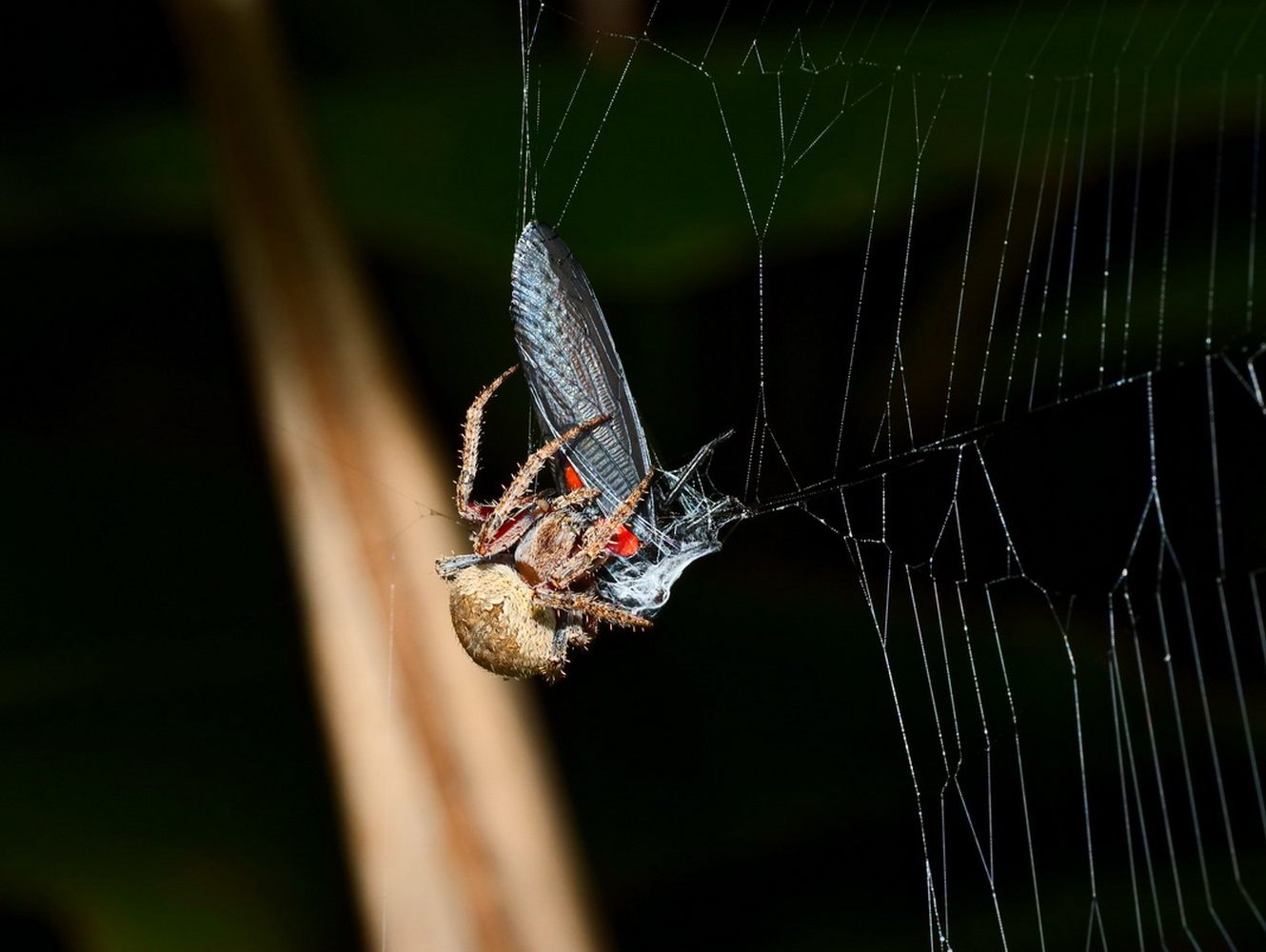 剛羽化的黑翅蟬誤入蜘蛛網
