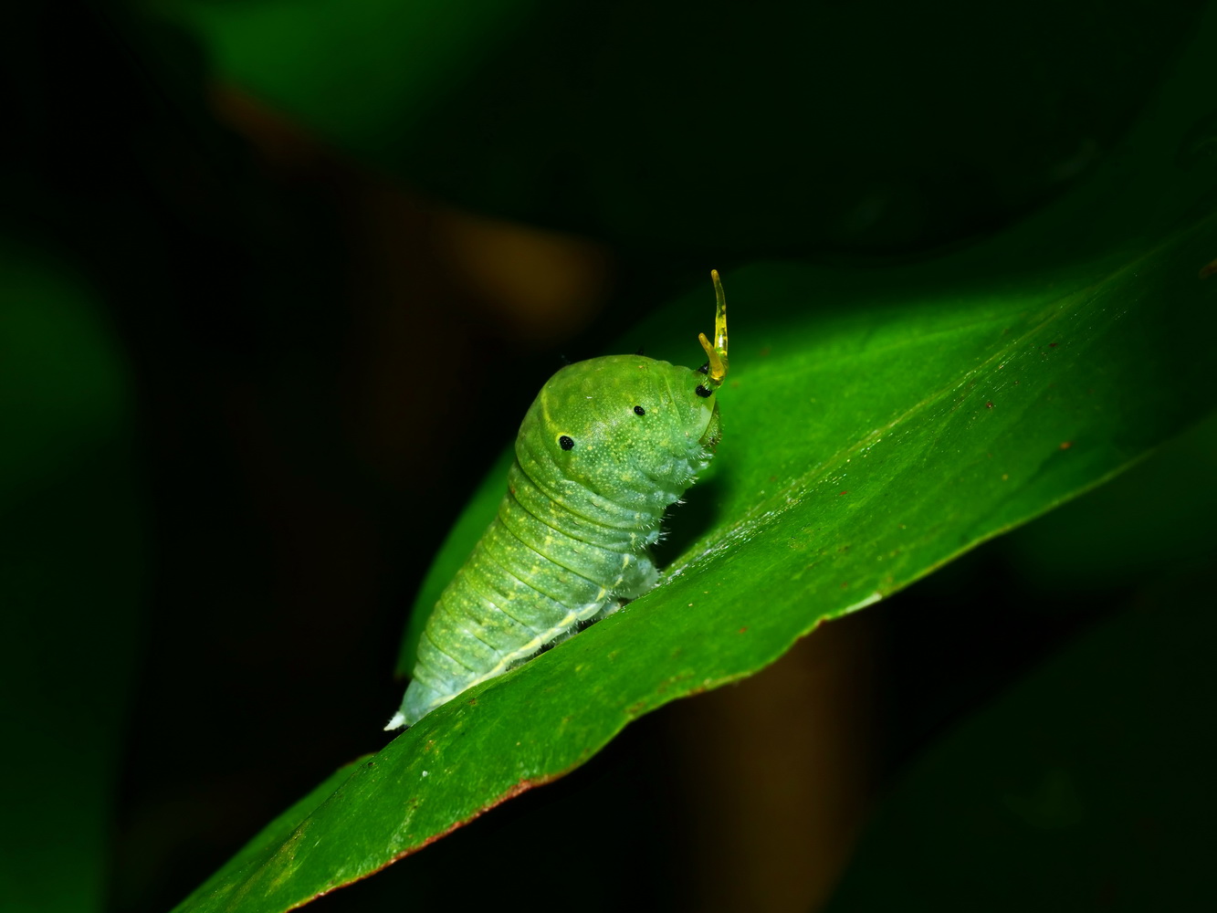 青帶鳳蝶幼蟲攝食大葉楠葉時伸出臭角嚇走天敵