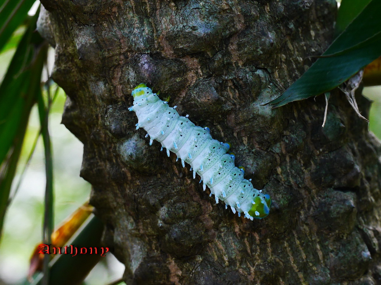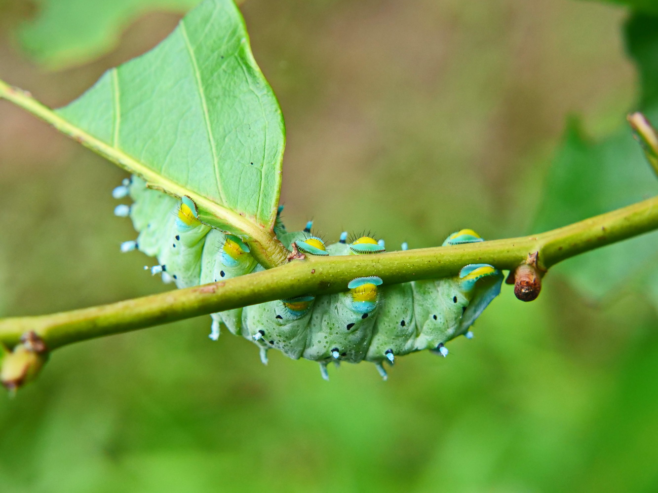 眉紋天蠶蛾幼蟲在食茱萸上爬行