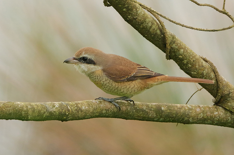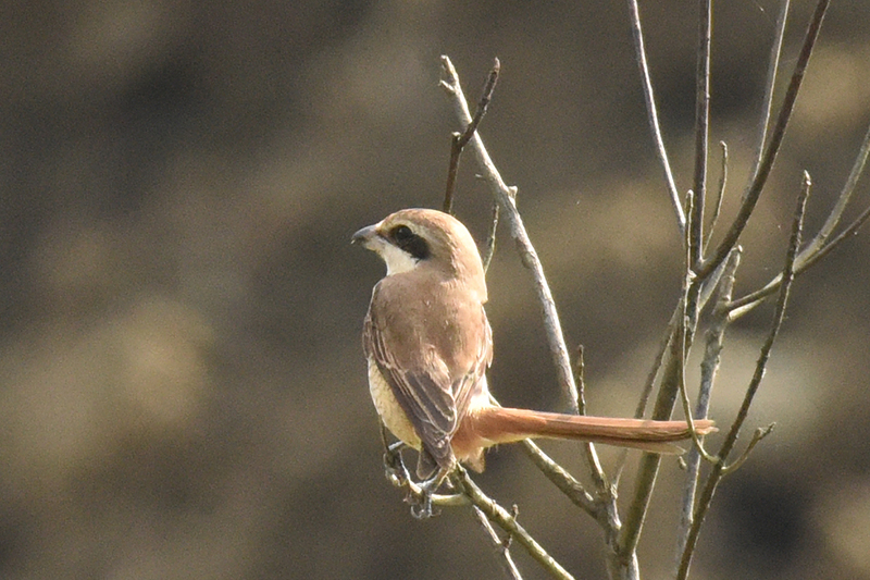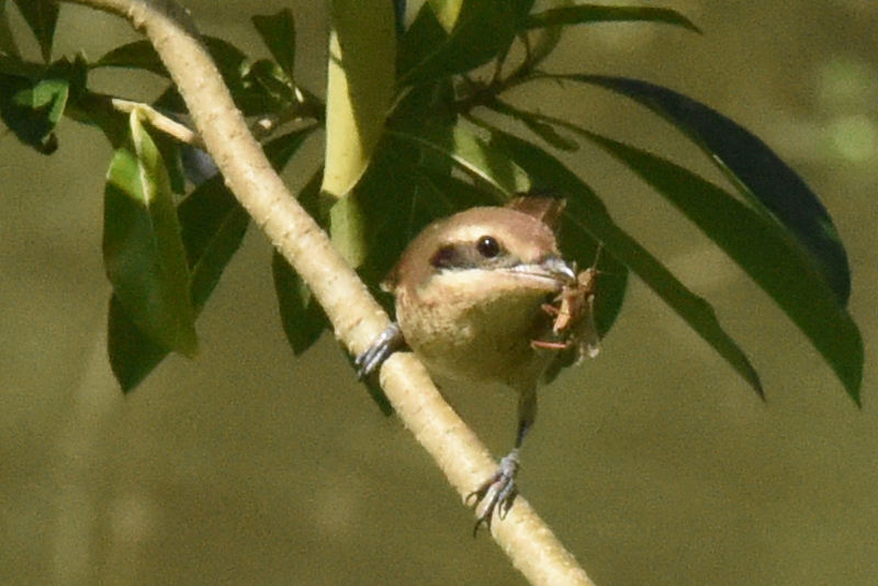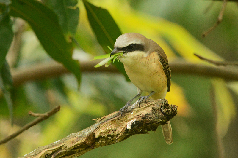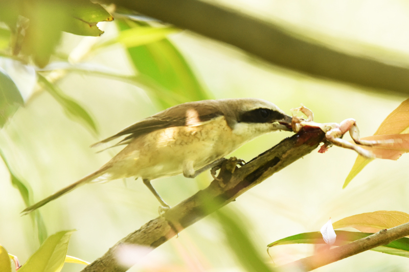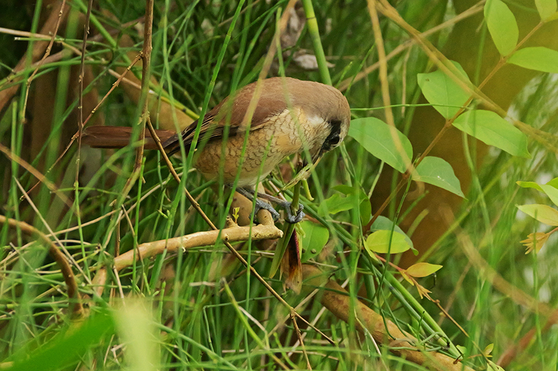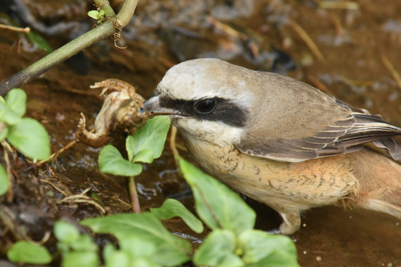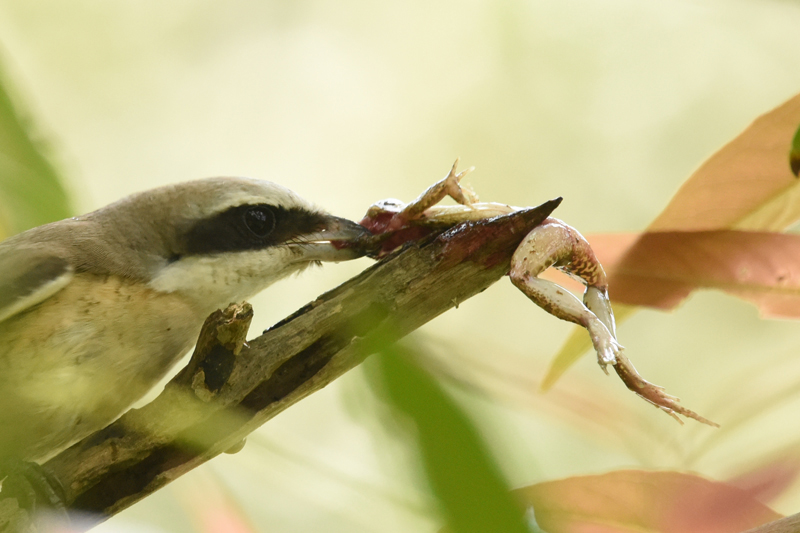 紅尾伯勞準備將吃剩的澤蛙插在尖樹枝上