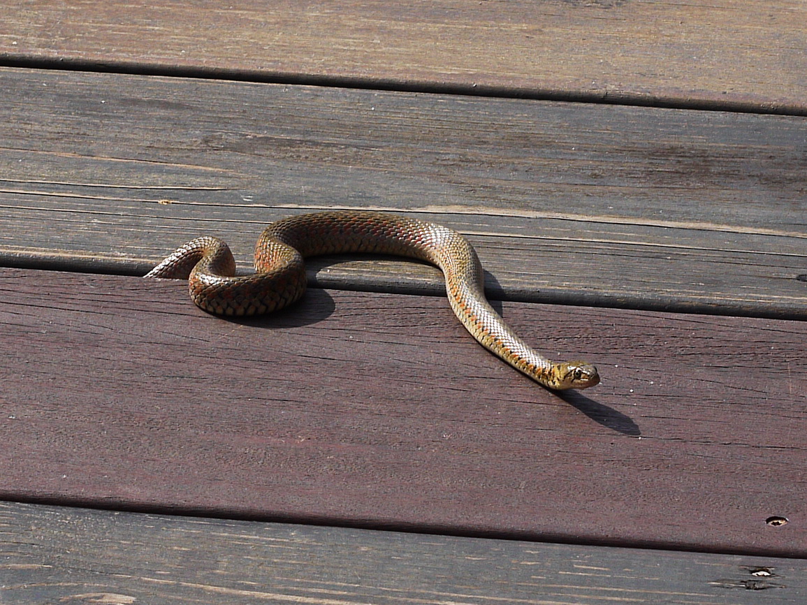草花蛇在木棧道上曬太陽